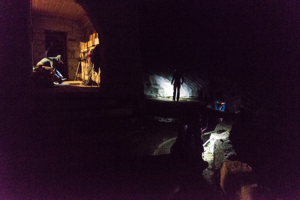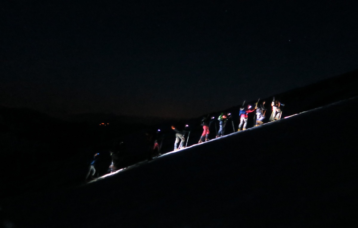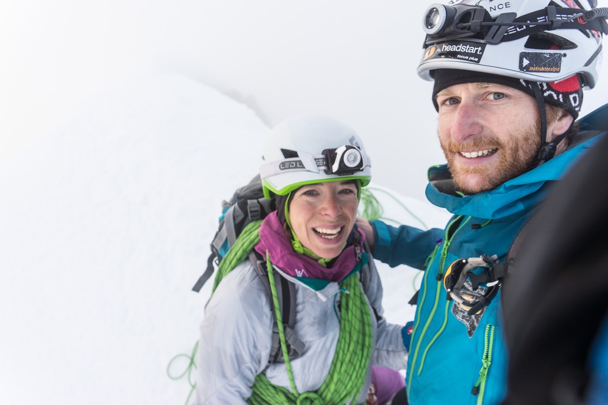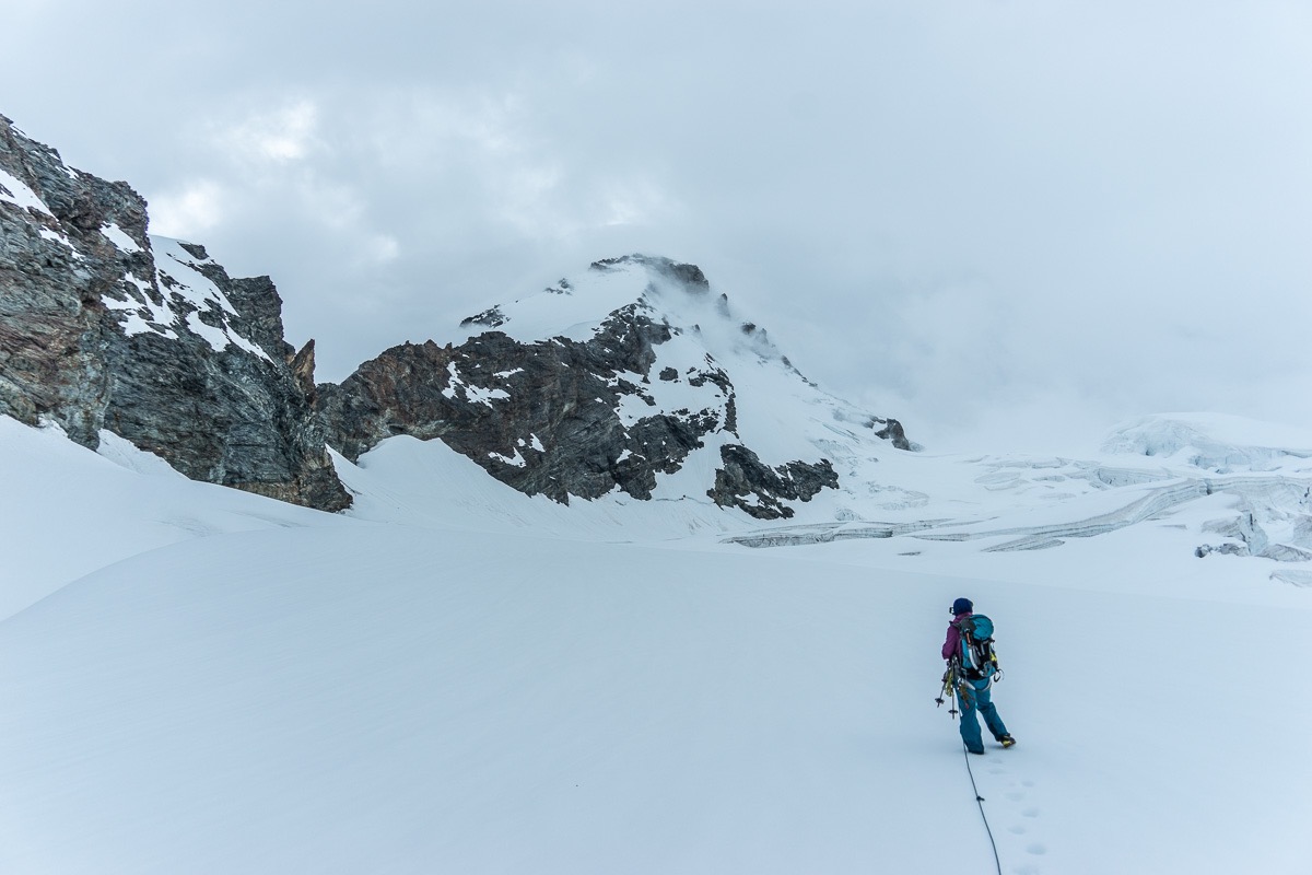 Um Mitternacht zweifeln wir an unserem Verstand. Nur zweieinhalb Stunden nach dem Sonnenuntergang sitzen wir beim Frühstück. Stopfen uns ein paar Bissen Brot in den Mund. Und ziehen verschlafen los im Schein unserer Stirnlampen. Die Dunkelheit ist noch da, als wir uns im Einstieg zum Whymper Couloir befinden. Das ist vielleicht auch gut so, dass wir nicht alles genau sehen. Den wilden Bergschrund. Den Felsaufschwung, mit einer dünnen Eisglasur überzogen.