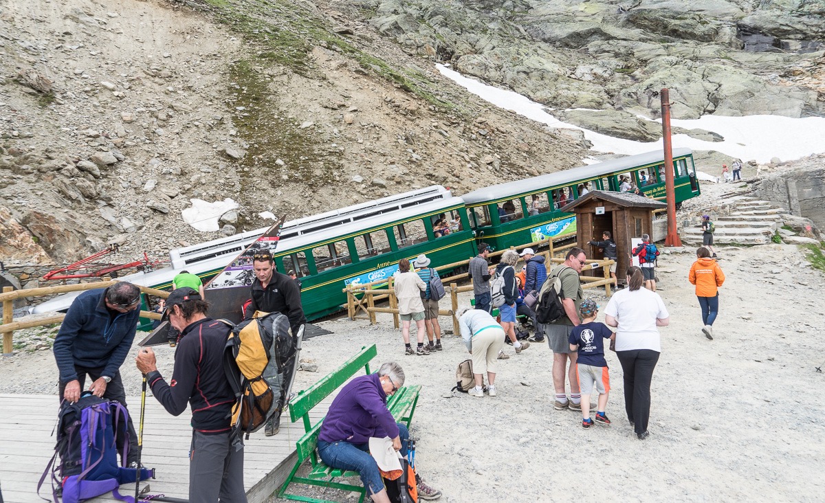 Blick zum Höhepunkt unserer Reise: da herrscht bereits reger Betrieb auf dem Mont Blanc.