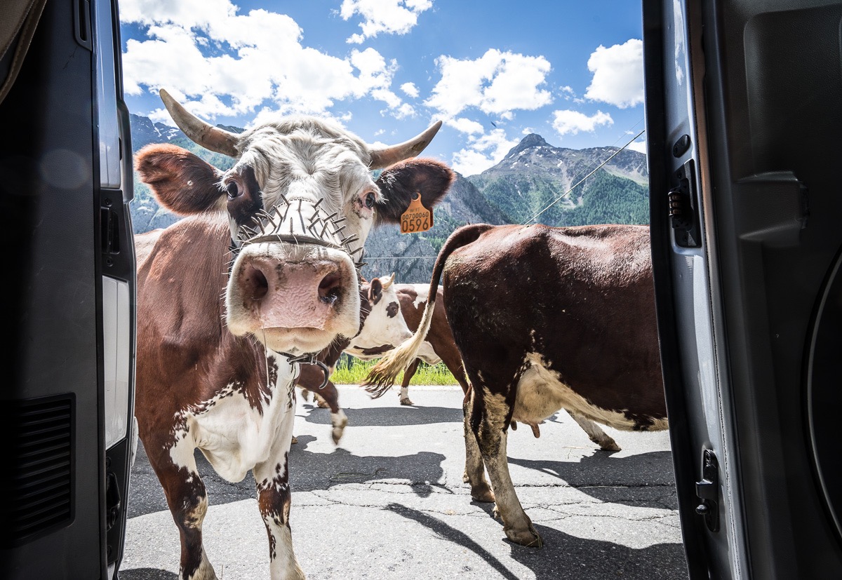 Im Aostatal werden wir freundlich, nun ja, wir werden begrüßt. Die Kuh lebt mit ihrer Herde in Bionaz. Das ist der Ausgangspunkt für die Dent d'Hérens. [Do dhero] oder so irgendwie spricht man sie übrigens aus.