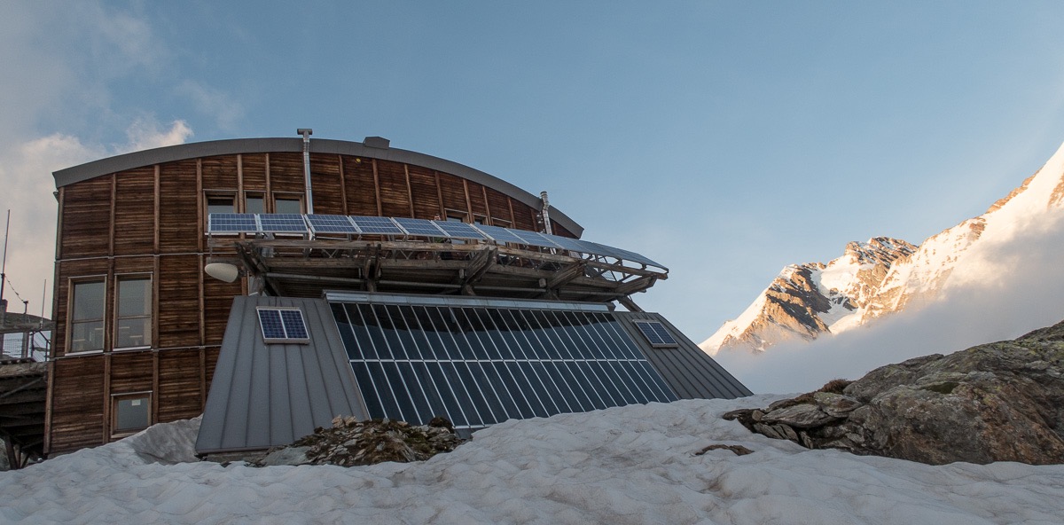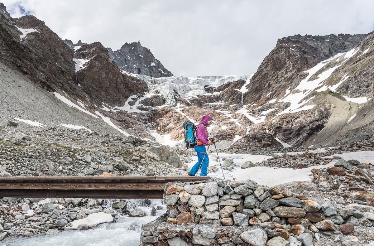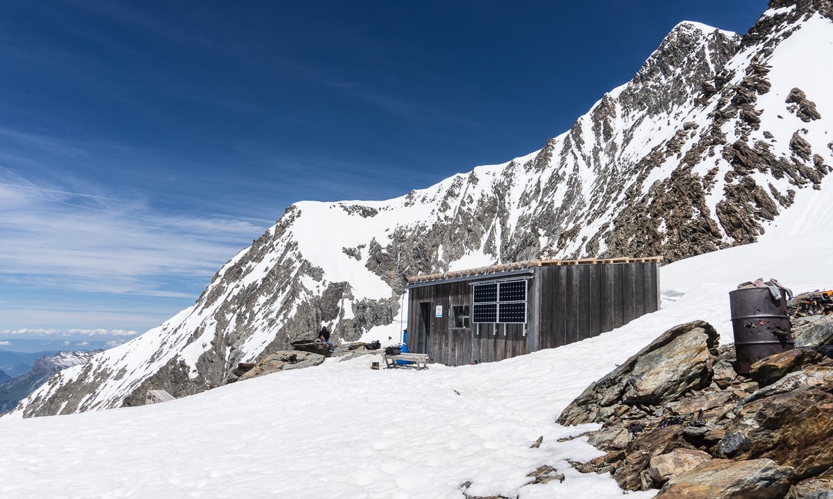 Sie selber kommt gar nicht weg. Links und rechts pfeift es über wilde Gletscherflanken hinunter. Vorne und hinten geht's auf steilen Graten aufwärts. Im Freien steht das Plumpsklo. Das hat aber meistens von unten eisigen Aufwind. Mit Augenzwinkern sagt sie (und meint das ernst):