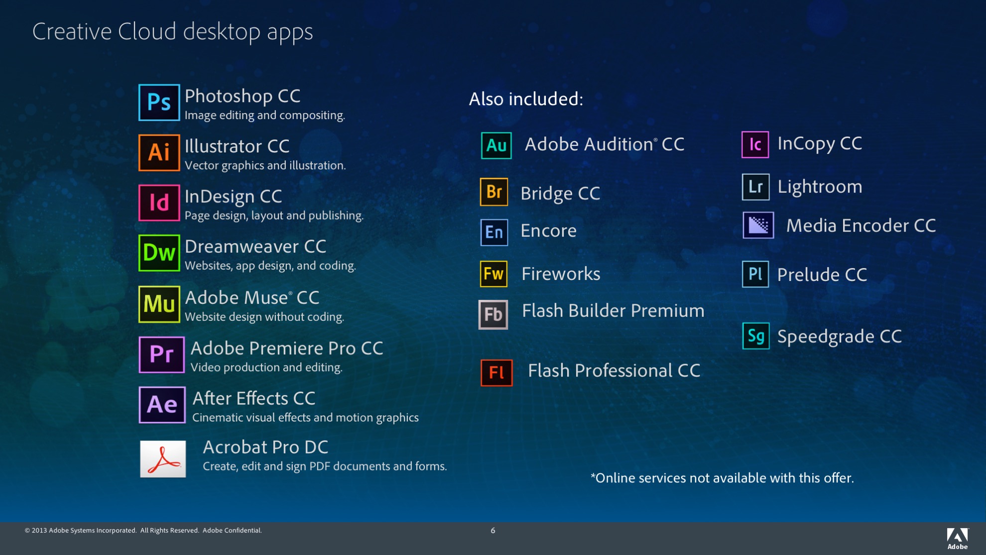 - Accès universel — Dotez vos étudiants, vos enseignants et votre personnel administratif des tout derniers logiciels de référence afin qu’ils puissent créer, partager et publier des communications attrayantes sur l’ensemble des médias et équipements.