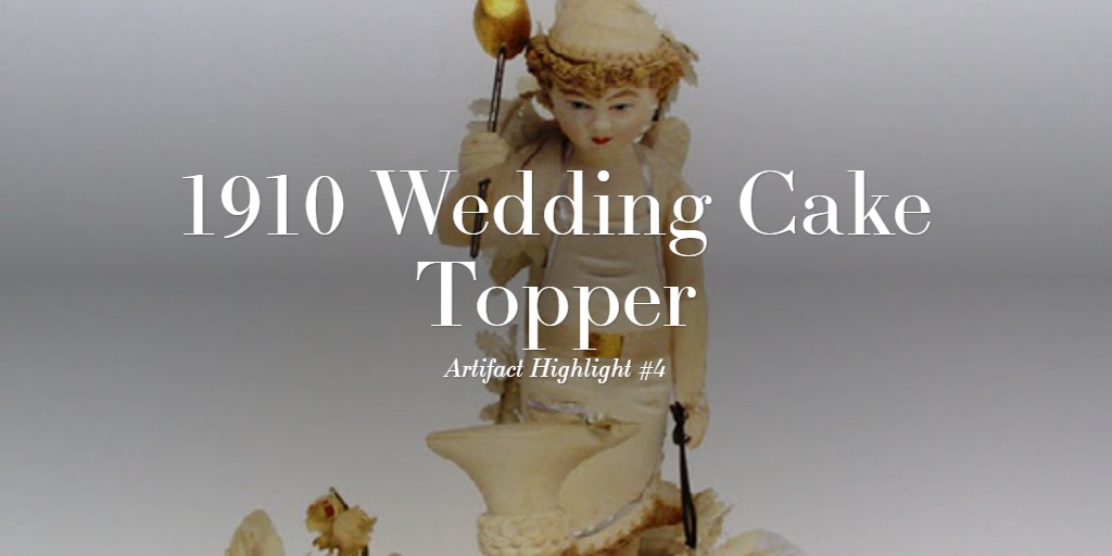 This ornate white wedding cake topper was donated to Placer County Museums in 1980. It was used at the wedding of Adeline and Anthony Perry in 1910. It is made of gypsum plaster and depicts a cupid blacksmith forging a ring, a symbol of love and marriage. Behind him is a candleholder covered in ornate floral and scroll design.