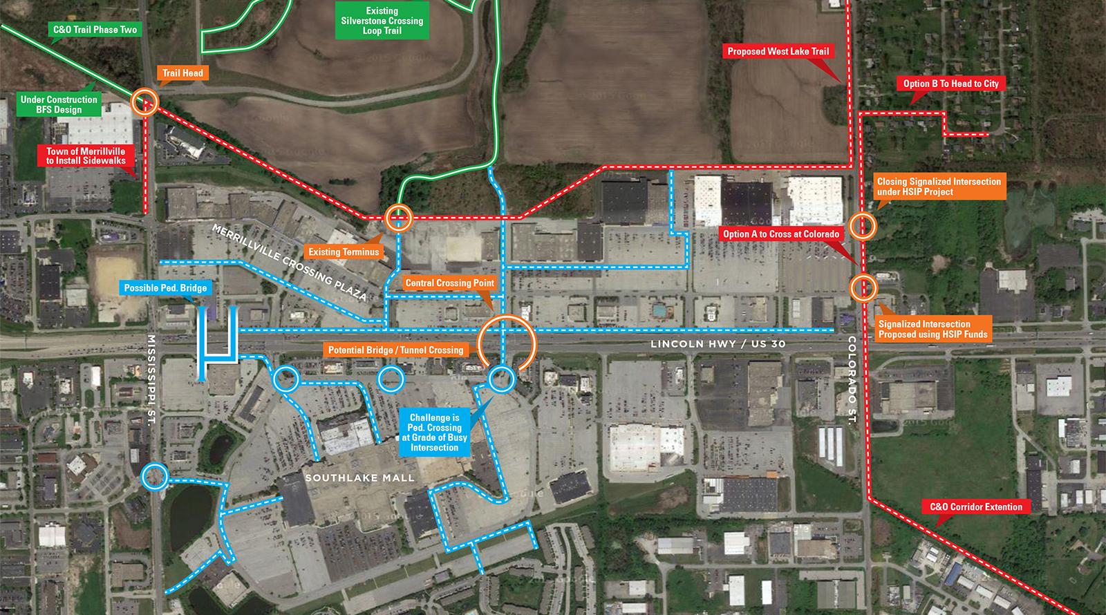 In 2017, NIRPC conducted a safety planning study for the surrounding area of I-65 and US 30. NIRPC with the consultants conducted three workshops to solicit input on the project at the Southlake Mall. The study identifies key recommendations and policies as well as priority areas of focus for future improvements and implementations. The plan includes five phases of planned projects for implementations and connectivity of the roadway that need early and ongoing coordination between Merrillville, Hobart, INDOT and NIRPC.