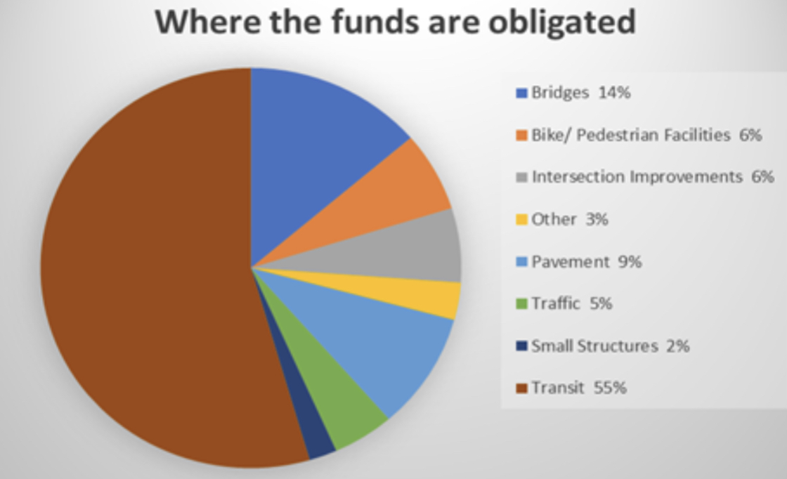 In fiscal year 2018, the federal government allocated $176,304,538 for projects in Lake, Porter and LaPorte Counties. These projects had a variety of sponsors, including Indiana Department of Transportation, counties, municipalities, transit operators, and NIRPC. The following graph shows the general type of projects that these funds were spent on. In general, obligated funds were spent in seven different areas: