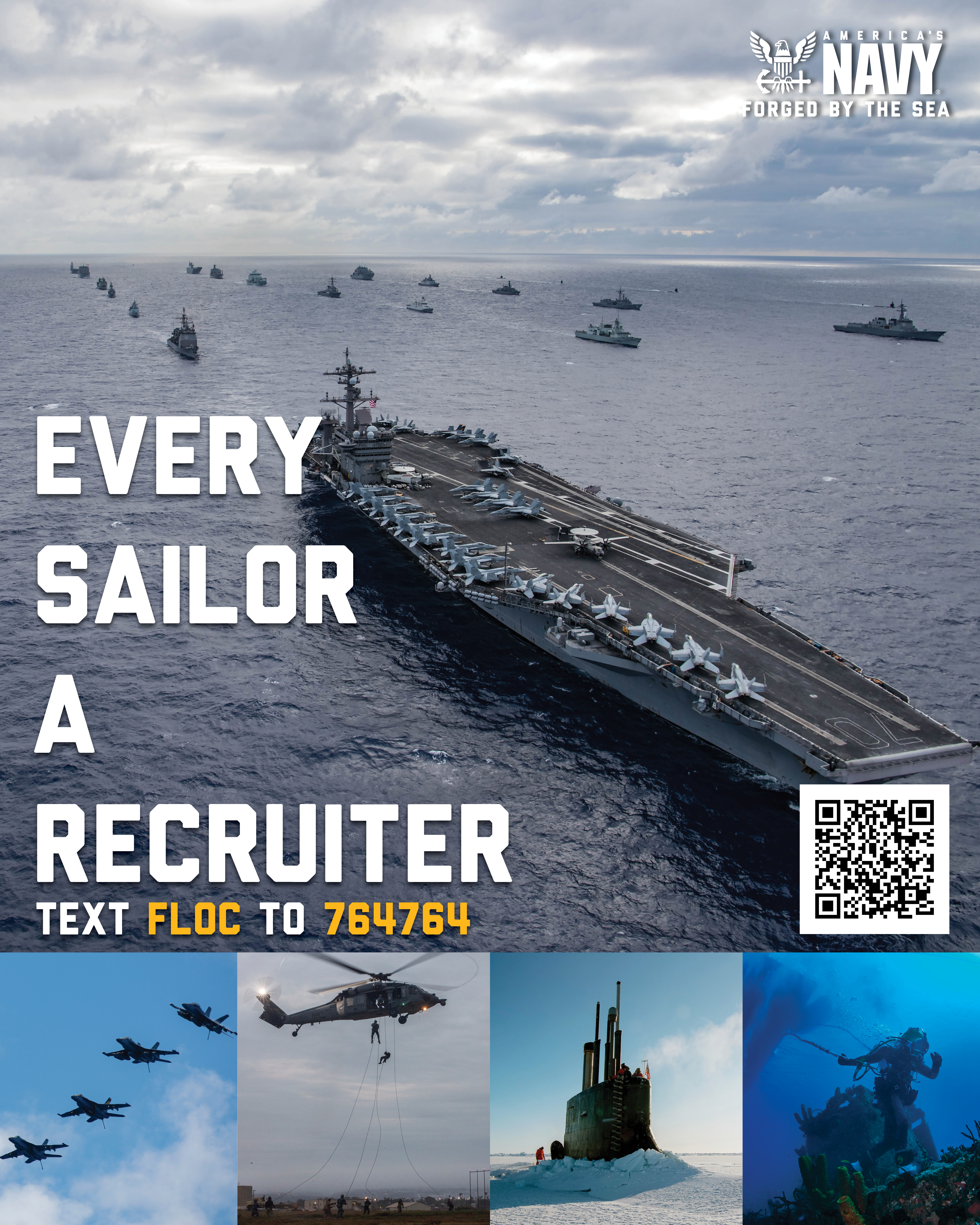 Allchin emphasized that every Sailor is an “ambassador” for the service, encouraging Sailors to text “FLOC” to 764-764 if they encounter someone suitable for the Navy. The provided text links the Sailor to a survey page for submitting the potential recruit’s contact information, facilitating a recruiter’s connection with them.