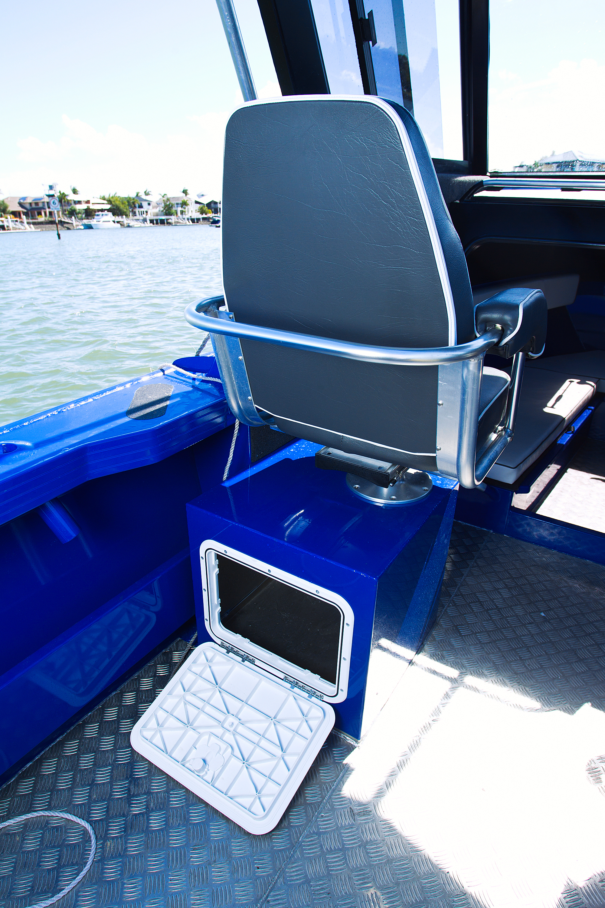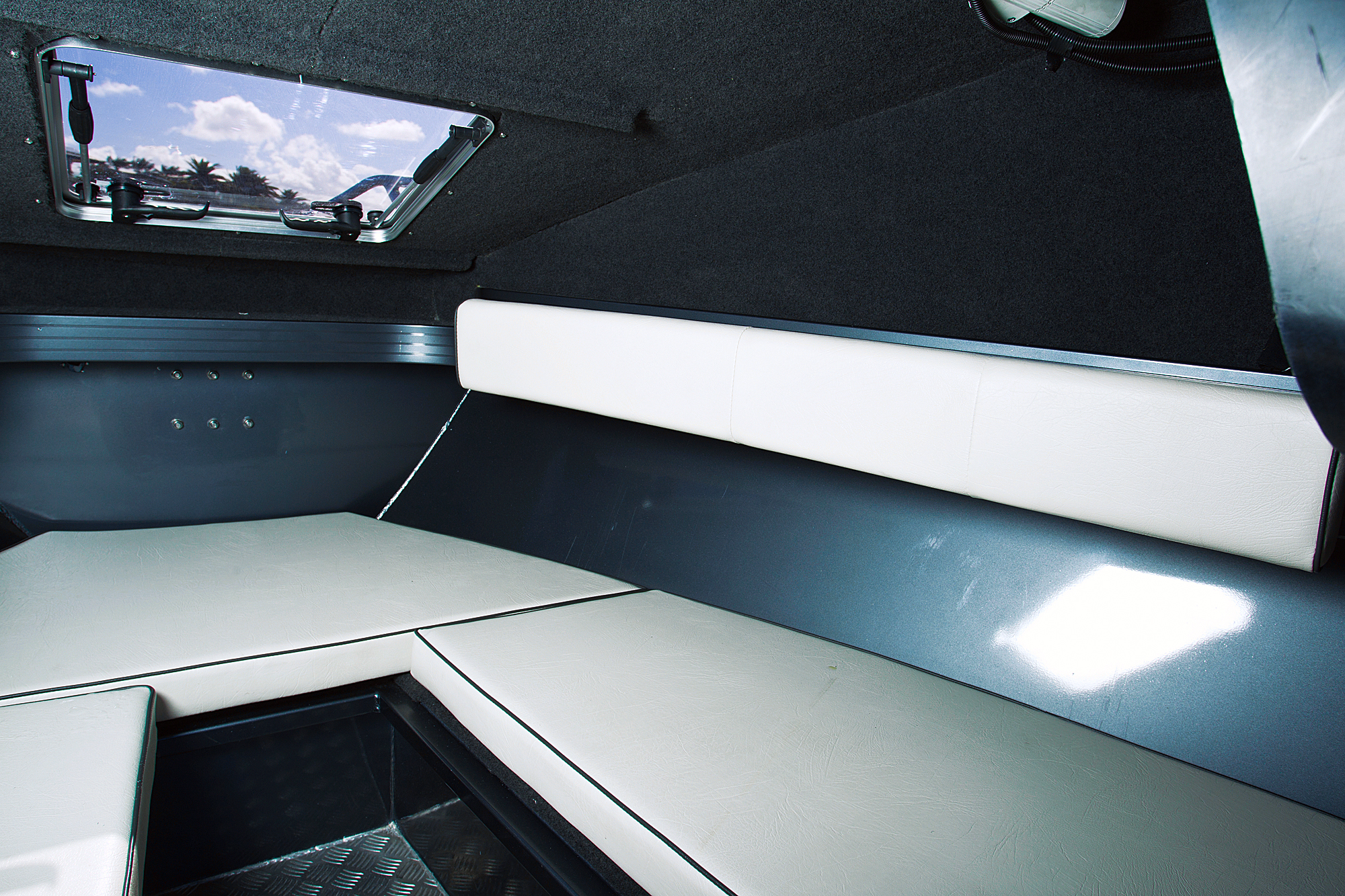 While fishing is the YELLOWFIN'S forte, the generous lined cabin offers welcome respite for captain and crew during extended voyages.The optional cabin cushion package completes the sumptuous appointments and adds a softer side to this predator's personality.