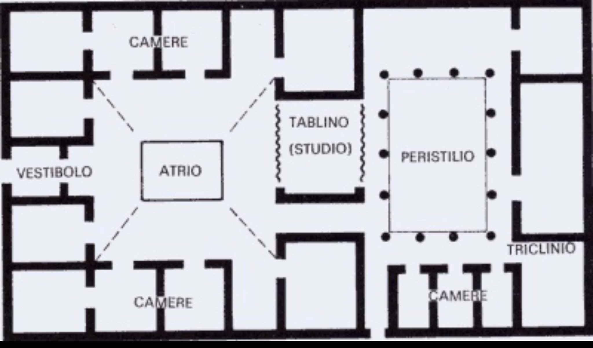 Attorno all'atrium sono dislocate le altre stanze, ognuna delle quali ha una sua funzione: il tablinum era la stanza principale di soggiorno utilizzata come sala di rappresentanza; i cubicula servivano solo come camere da letto; le alae erano i locali di servizio. Attraversando un corridoio (andron), si accede alla seconda parte della domus, il peristylium, un giardinetto circondato da portici e decorato con colonne, piante, statue e fontane. Intorno al peristylium si aprono altri ambienti: il triclinium (la sala da pranzo), altri cubicula, la cucina, il bagno e latrine private, gli oeci (sale per i ricevimenti)
