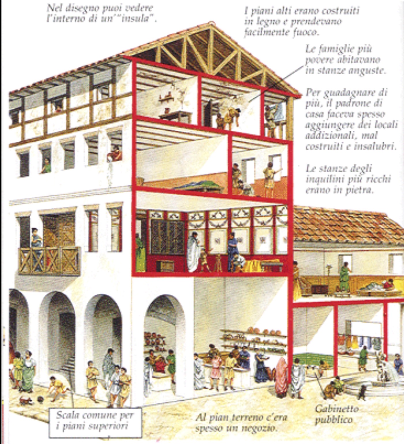 Se talvolta piccola borghesia e proletariato condividono la stessa insula (abitando, tuttavia, in piani diversi e con diverse condizioni: in abitazioni a più stanze e ben illuminate i primi, in stanzette buie e senza areazione i secondi), ben presto le due classi cominciano a vivere in strutture diverse e vengono a crearsi insulae per la borghesia, strutture fornite di acqua e servizi, e insulae per il proletariato, dalle condizioni fatiscenti e senza alcun tipo di servizio. L'unico privilegio per loro era un balcone che spesso correva al primo piano, unendo gli appartamenti
