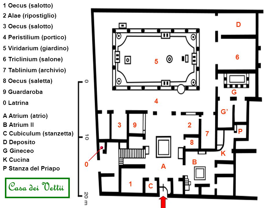 La domus (dal latino "casa") era un'abitazione riservata alle famiglie patrizie, costruita con mattoni o calcestruzzo (impasto di sabbia, ghiaia, acqua e cemento). Era formata in genere da un unico piano (a volte ce n'era un secondo, ma solo nella parte interna) e strutturata attorno a due ambienti centrali: l'atrium (cortile aperto) e il peristylium (giardinetto). L'atrium è il locale centrale quadrato o rettangolare che presenta un'ampia apertura sul soffitto (impluvium), alla quale corrisponde sul pavimento una grande vasca (compluvium) per il raccoglimento dell'acqua piovana. All'atrium si accedeva dalla strada, prima attraverso il vestibulum (vestibolo) e poi dalle fauces (corti corridoi)