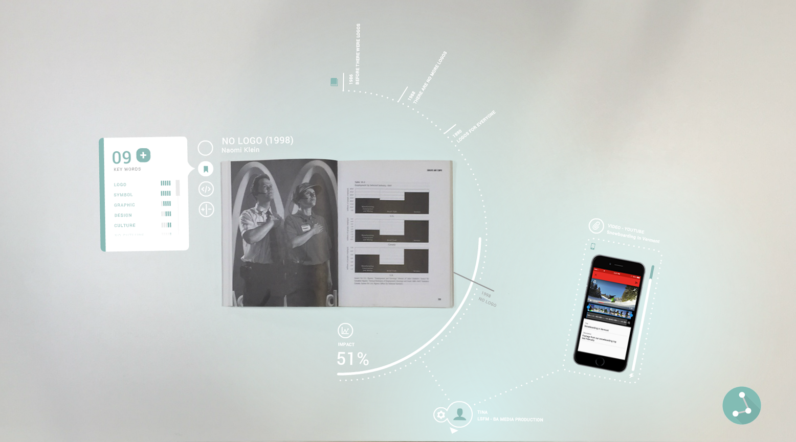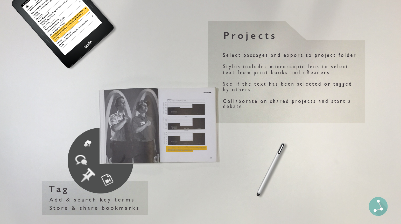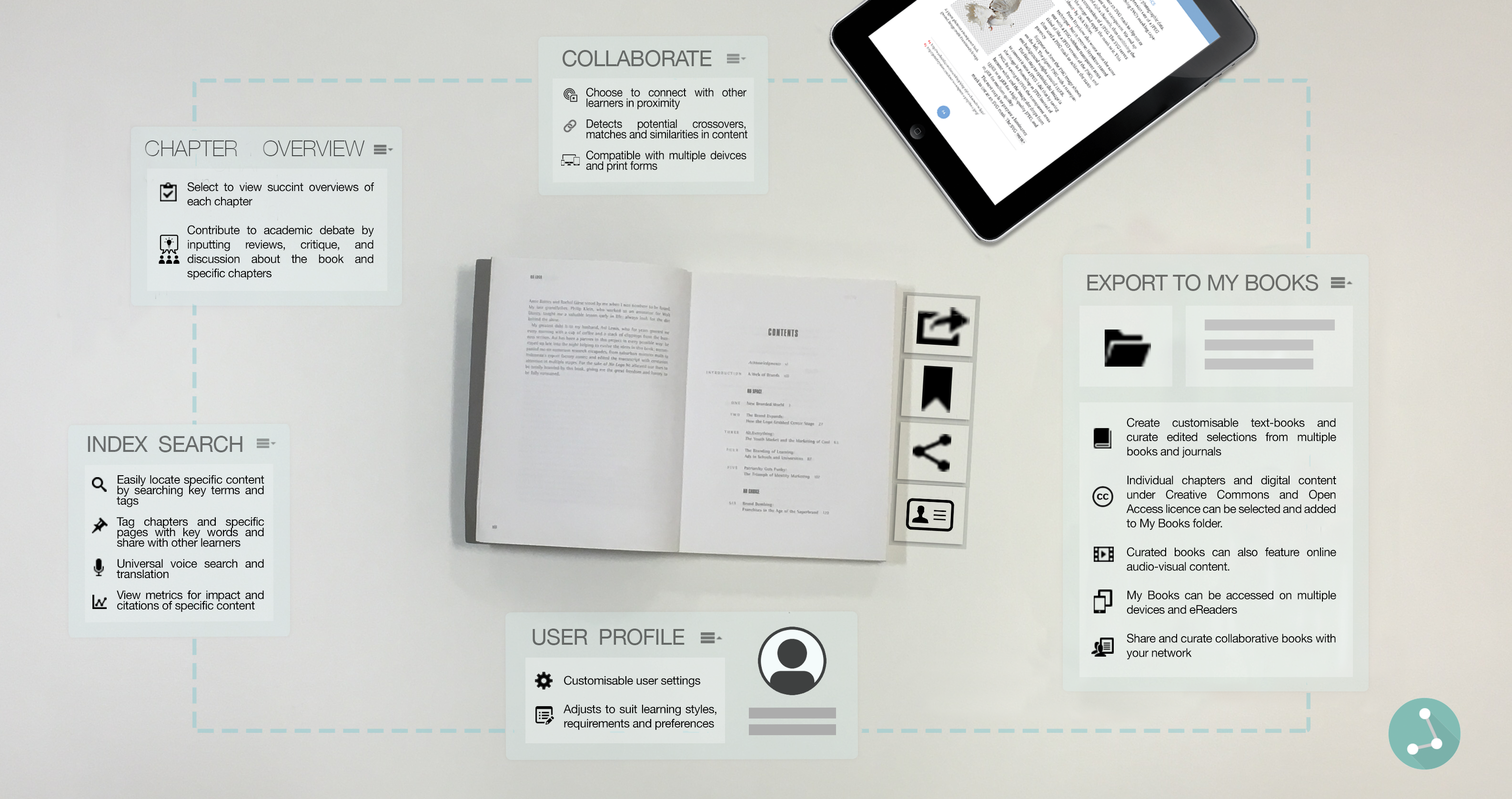 After a week of collaborative research, discussions and ideation, a central concept was developed: rather than replacing the book in its current form(s), we wish to develop an interactive, multimodal system for augmenting the book. The principle here is to connect many ‘containers’ of knowledge (print books, eReaders, journals, etc.) and enable different devices and applications to be integrated in order to deliver a variety of multiplatform / multimedia / multisensory features that can support learning, engagement and comprehension. Our discussions and research highlighted a number of preferable functionalities and learning requirements for academics in the 21st century:
