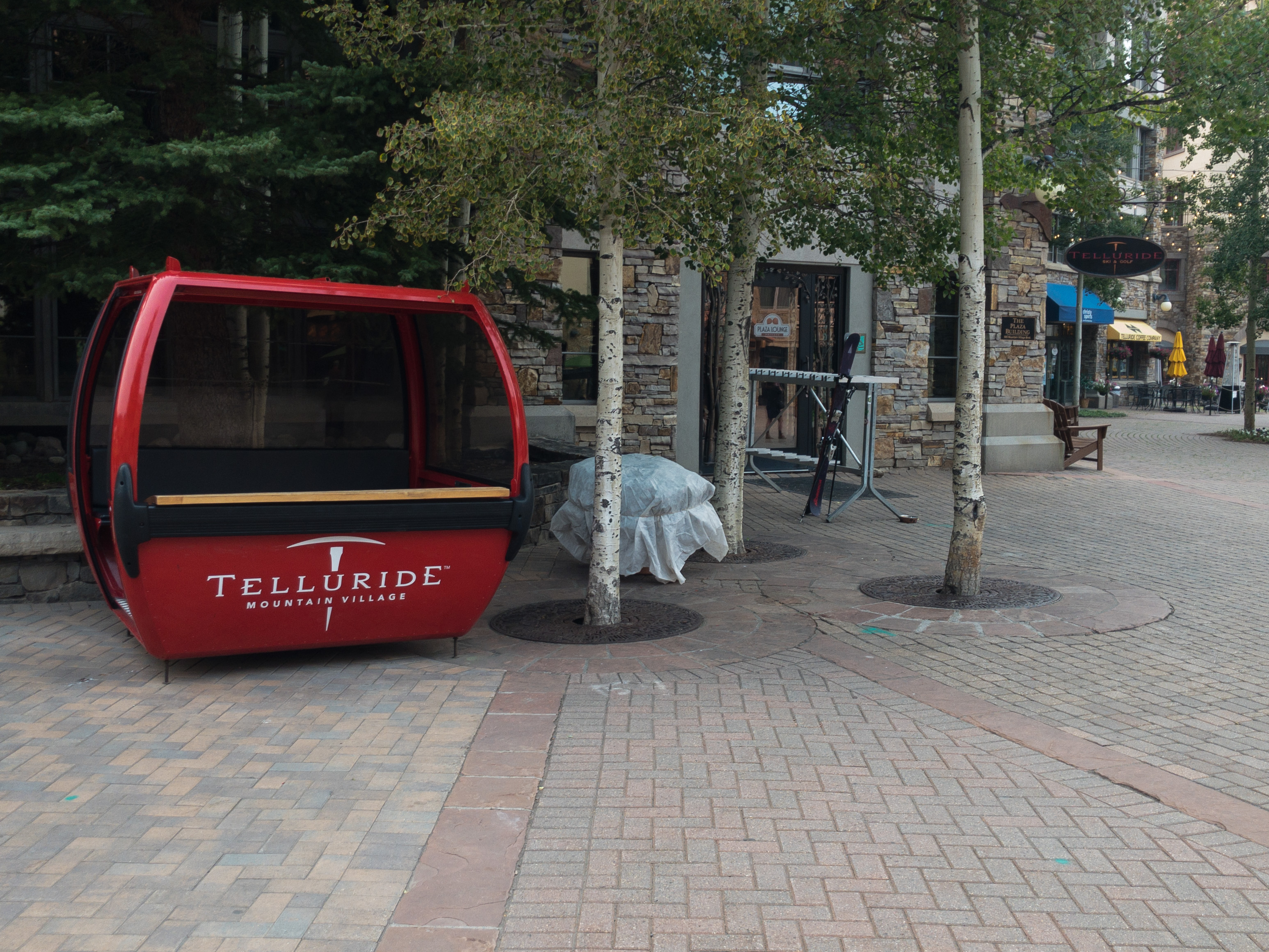Telluride's first ski lift was in 1972. This car is in the main plaza. Every Telluride sign bears the pick-axe as a symbol of Telluride’s mining history. It is one of the top ski resorts in North America. We enjoyed strolling the plaza.