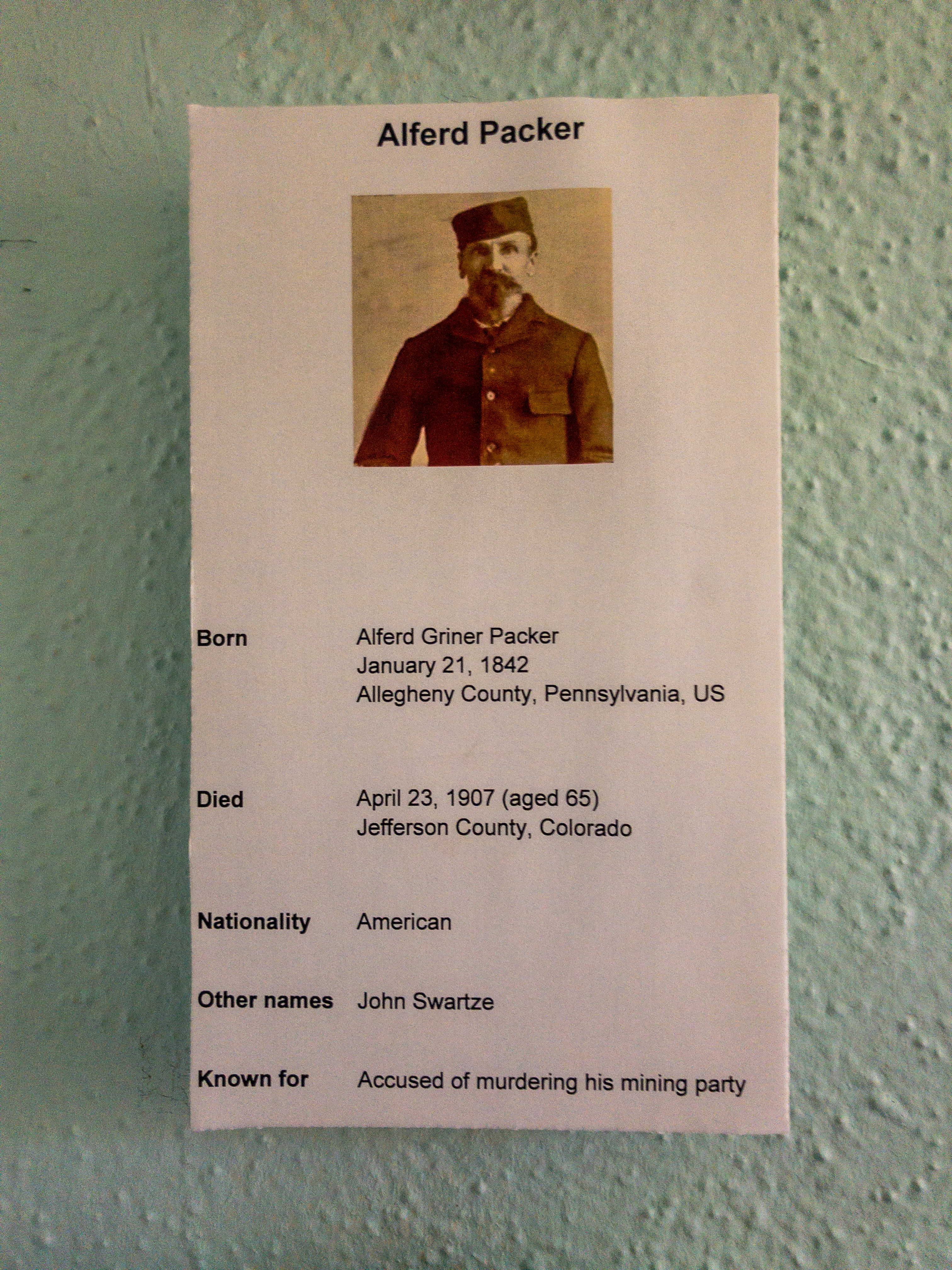 Alferd Packer, also known as "The Colorado Cannibal", was a prospector and wilderness guide who confessed to cannibalism during the winter of 1874.