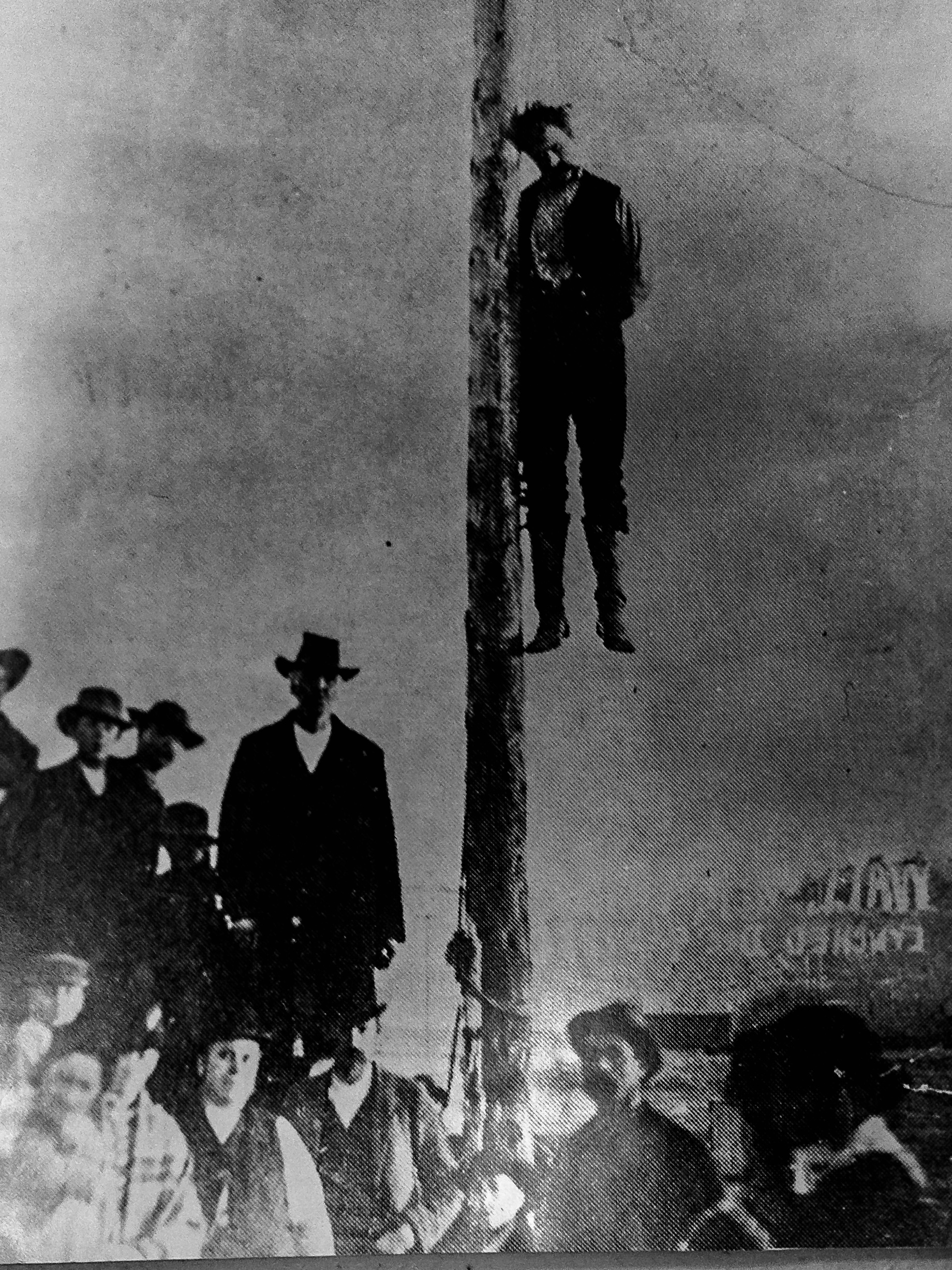On the same evening he was taken out of the jail by a lynch mob and hung on the telephone pole at First & Main Street. Note: in Witherall's haste to dress, his boots were on the wrong feet.
