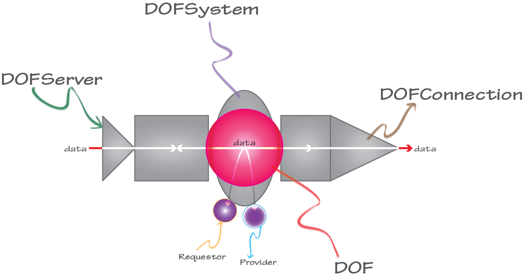 - Provider. Like the Requestor, it is a node that is attached to a DOFSystem; but instead of requesting information, the Provider makes that information available—or provides that information—to the Requestor. (Here, too, you can attach as many Providers as you need.)
