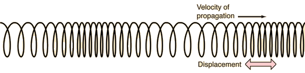 Longitudinal waves move parallel to the direction traveled. They are capable of traveling through solids and liquids, and are like pulses in a slinky.