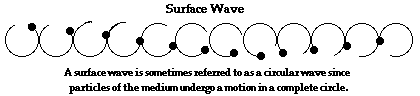 Surface waves move in circular motions. They are mechanical waves that move along the interface, usually as a gravity wave between two fluids with different densities.
