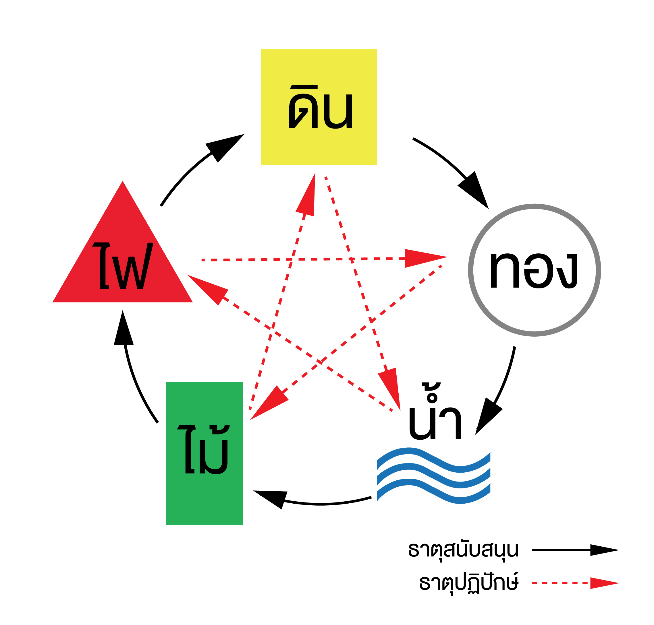 ในจักรวาลนี้ เราสามารถถอดสิ่งมีชีวิตและไม่มีชีวิต ให้อยู่ในกลุ่มได้ ๕ ธาตุ ได้แก่ ดิน น้ำ ไม้ ทอง ไฟ
