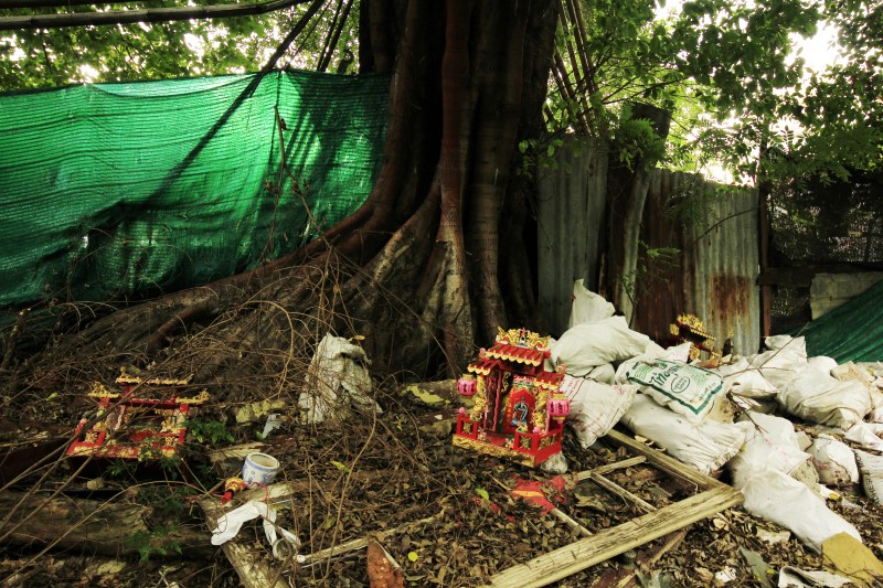 “รุ่นโบราณๆ ตั้งแต่สมัยผมเด็กๆ เขาจะนำลังไม้ ที่เอาไว้ใส่นมกระป๋อง มาจับพิงกับผนัง แล้วก็เอากระดาษสีแดงๆ มาปิดไว้ข้างใน หลังจากนั้นก็จะเขียนคำว่า ‘ตี่จู้’ ซึ่งแปลว่าเจ้าที่ลงไป คนโบราณเขาทำแบบนี้นะ บางคนก็ไม่เอาลังไม้ แต่ไปเอาฝาบ้านมาปิดกระดาษแดง แล้วก็เขียนคำคำเดียวกัน”