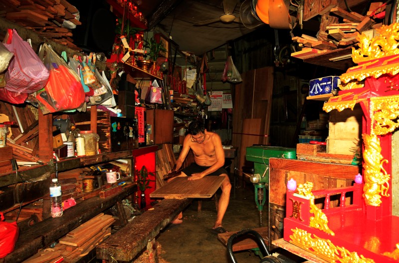“เวลาจะทำที ก็จะไปซื้อไม้แถวกรุงเกษม โดยรุ่นโบราณจะทำด้วยไม้สัก สมัยโบราณไม้สักไม่แพงนะ ตี่จู้จะเป็นหลังไม้ธรรมดาๆ ล้วนๆ ทาด้วยสีแดงอย่างเดียว อาจมีลงทองบ้างแต่น้อย แล้วก็พัฒนามาเรื่อยๆ ส่วนพวกพลาสติกก็เป็นส่วนประดับ ตั้งแต่มังกร เชิงชายพวกนี้ แต่สมัยโบราณยังไม่มีพลาสติกนะ ใช้การแกะสลักมือกันล้วนๆ ”