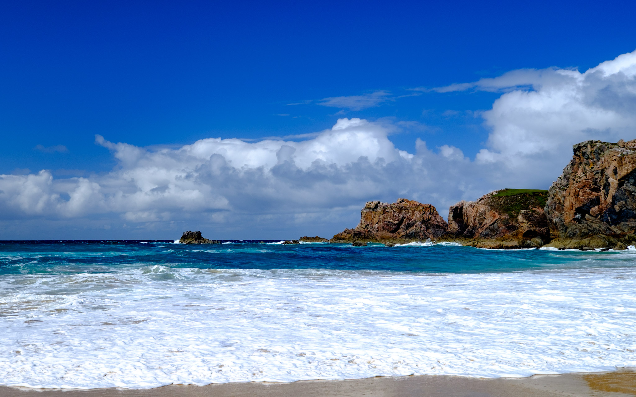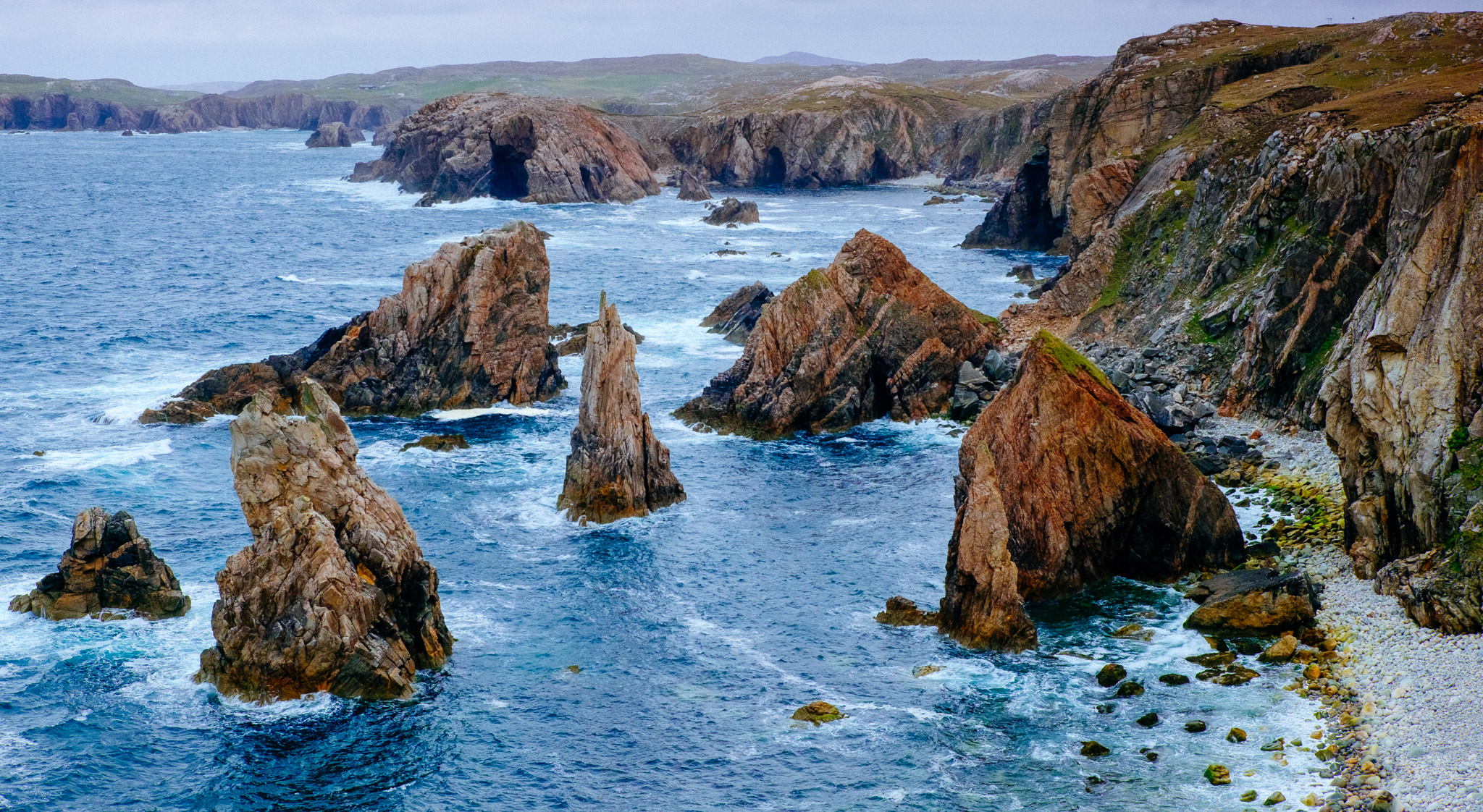 Lewis beaches - at times we had blue skies, fluffy clouds and rolling waves. The cliffs, rocks and sea stacks are prominent features.