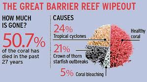 The Great Barrier Reef is not subjected to over population, instead we are worried for our sea creatures. Coral cover in the Great Barrier Reef has dropped by more than half over the last 27 years, according to scientists, a result of increased storms, bleaching and predation by population explosions of a starfish which sucks away the coral's nutrients.