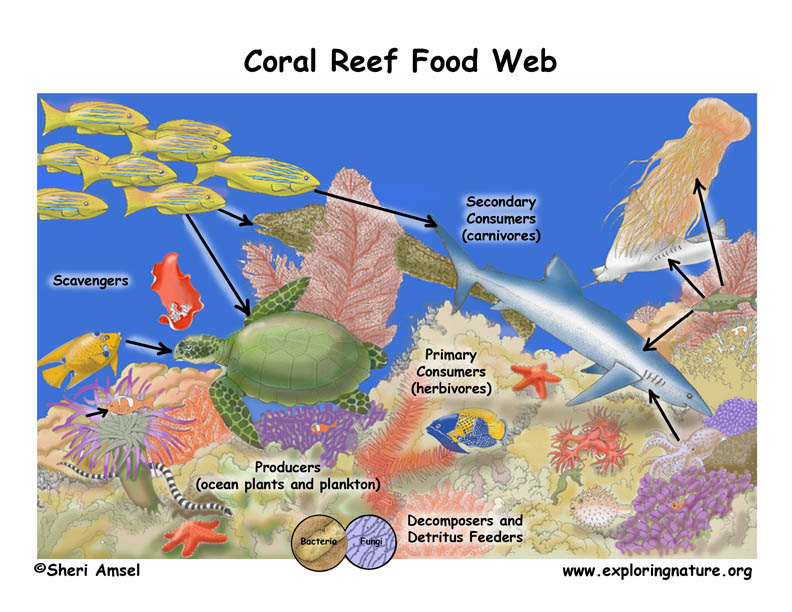 The biodiversity of reefs can also be appreciated simply for the wonder and amazement it inspires. Brightly colored, spotted, striped, speckled, or otherwise patterned fish swim in and around coral reefs; some specialize in eating different kinds of algae, keeping corals from being smothered by their potentially deadly competitors. Sharks, groupers, and other predatory fish keep populations of smaller fish and other organisms in balance. Parrotfish actually eat the reef itself. They scrape at the coral to get to the small algae (zooxanthellae) living inside the coral polyp, then grind up the coral skeleton with teeth in their throats and excrete it as sand.