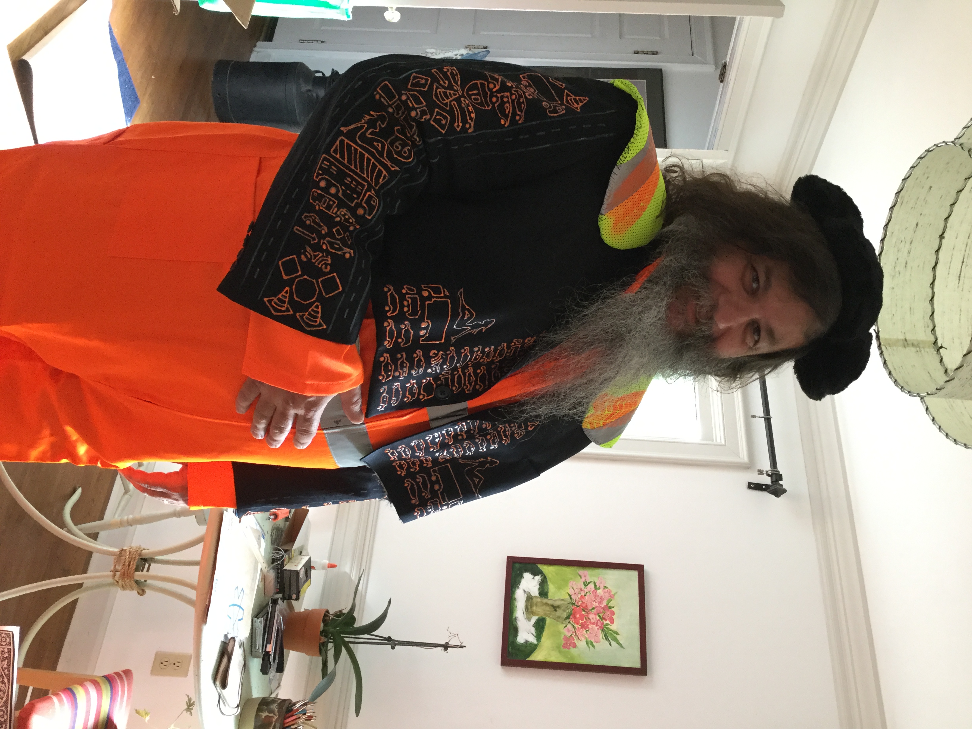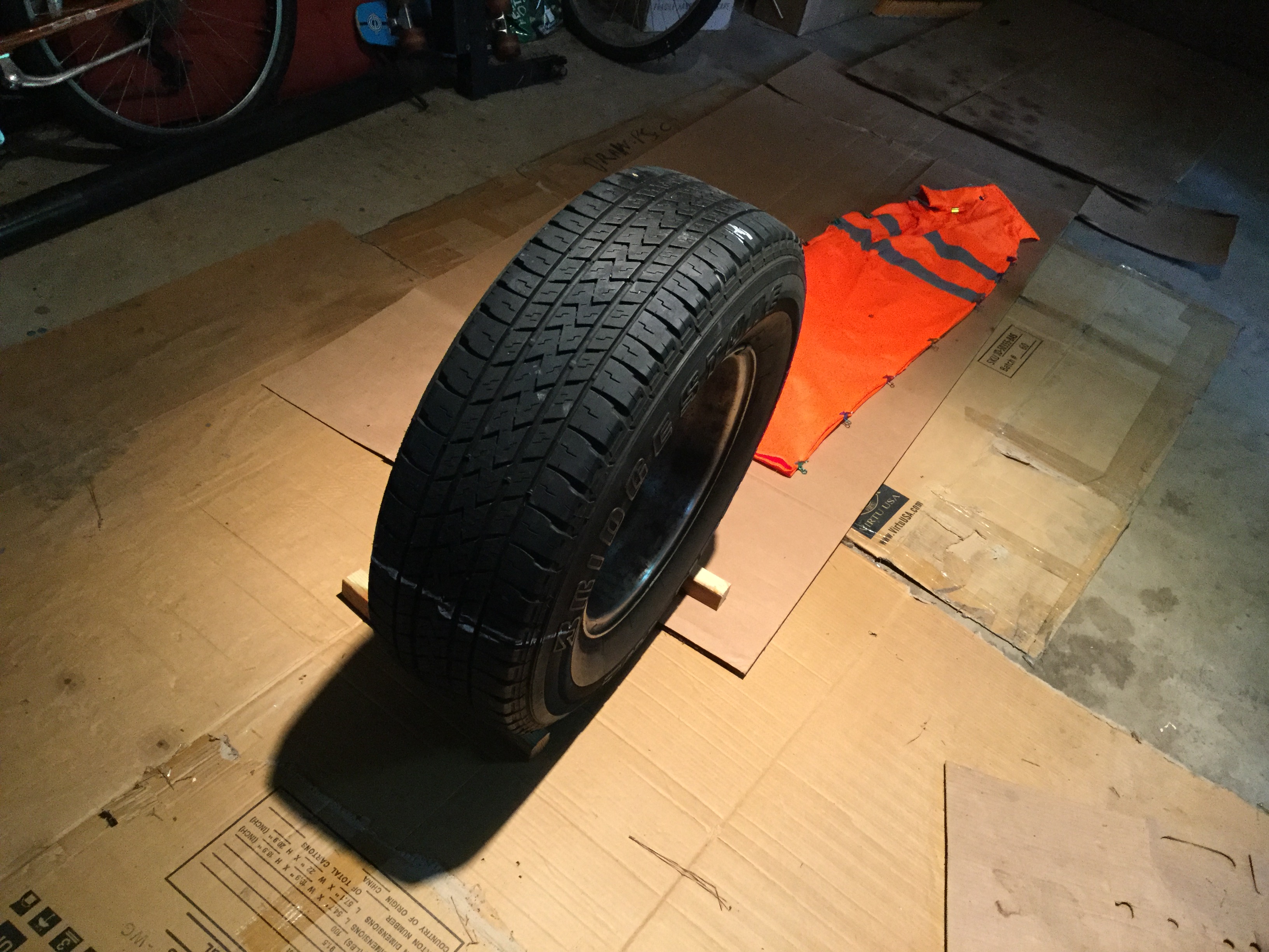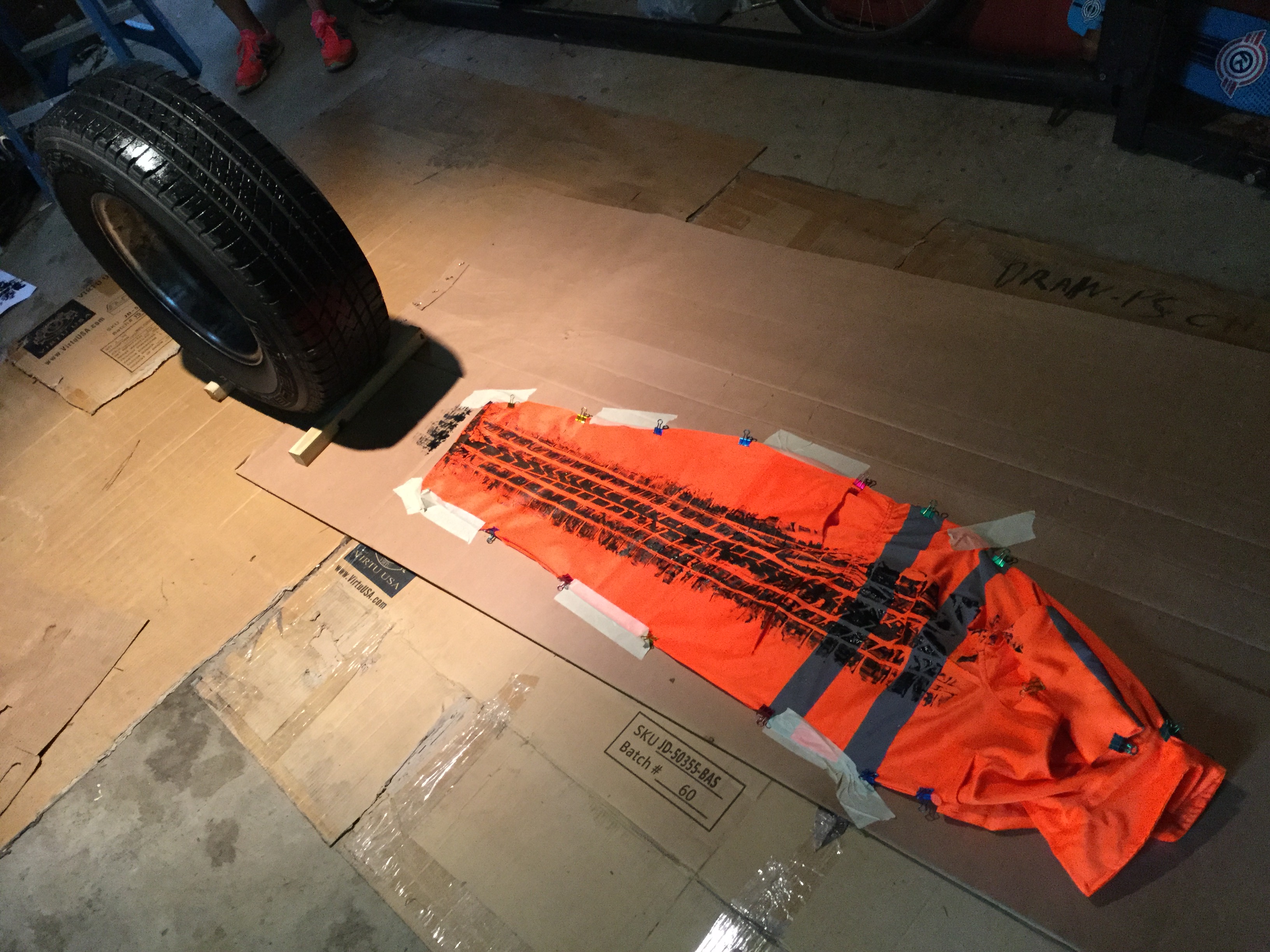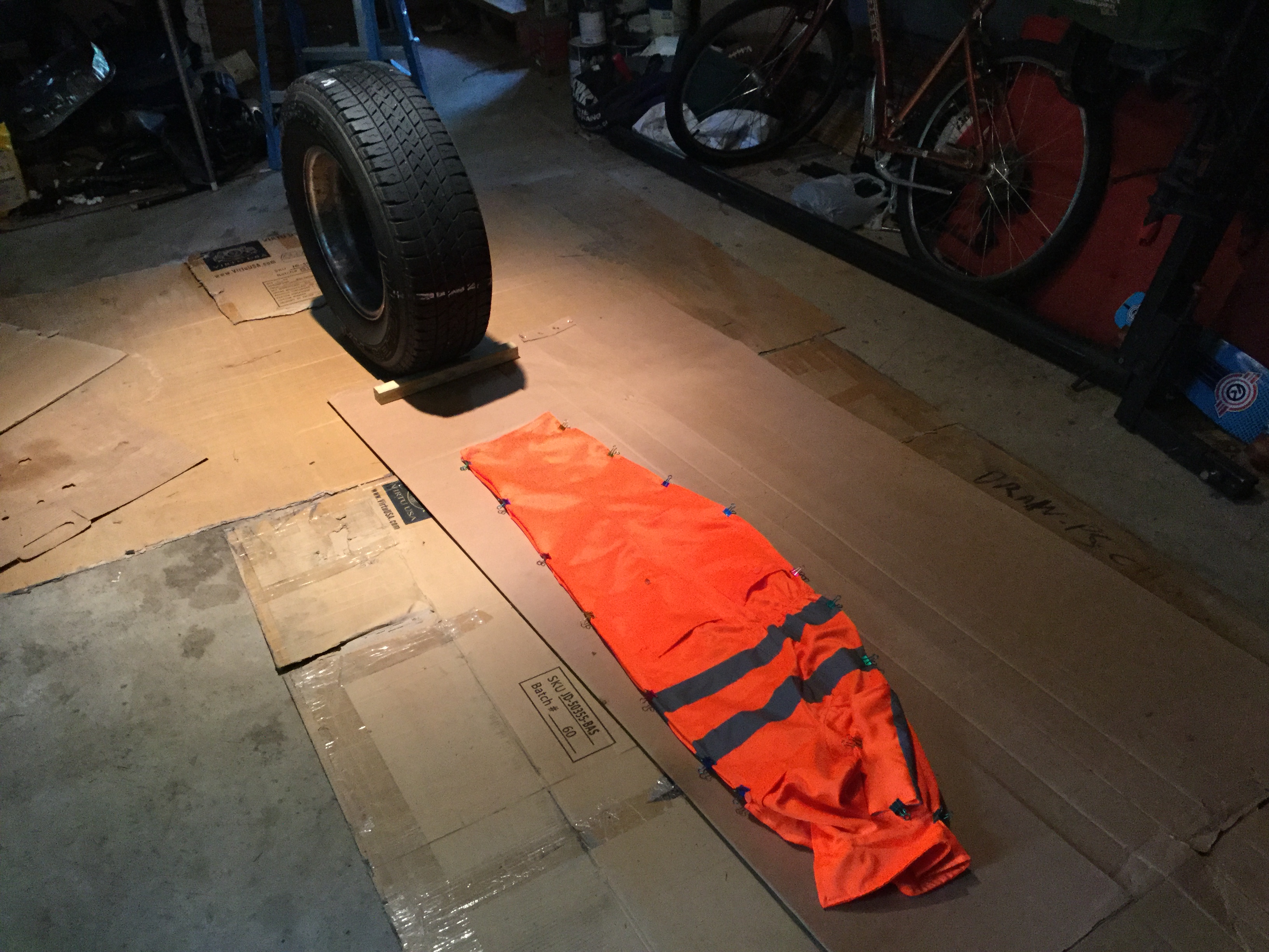 The shoulder pads were made by covering a couple of 6x9 metal speaker grill panels with fabric from a safety shirt. (and spray painted some tire treads) Unfortunately, had to get re-made it was making it trickier to key and roto..