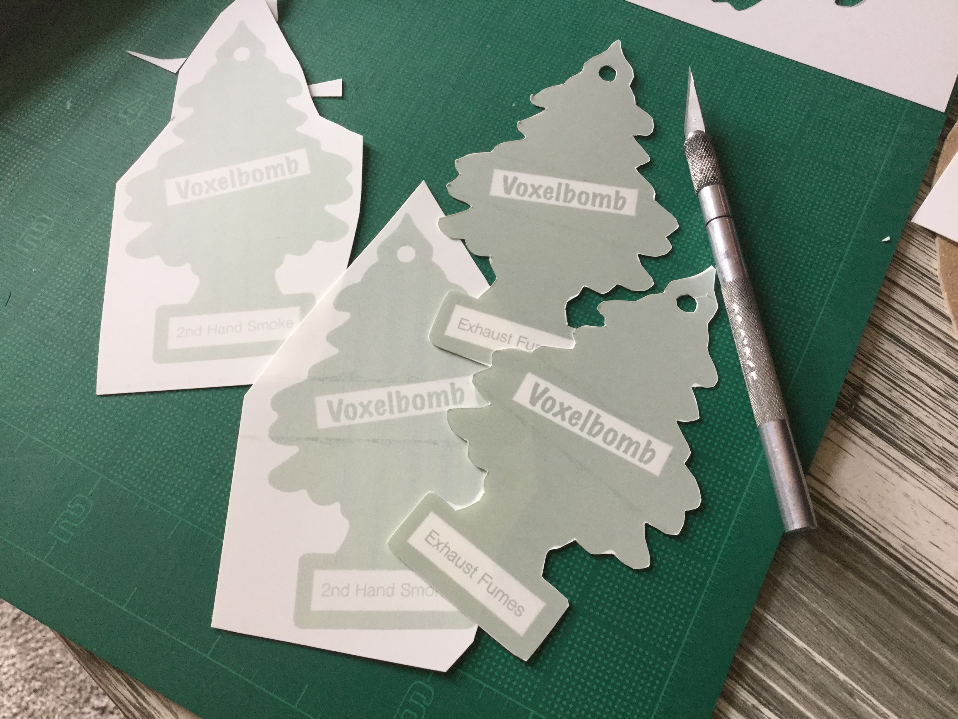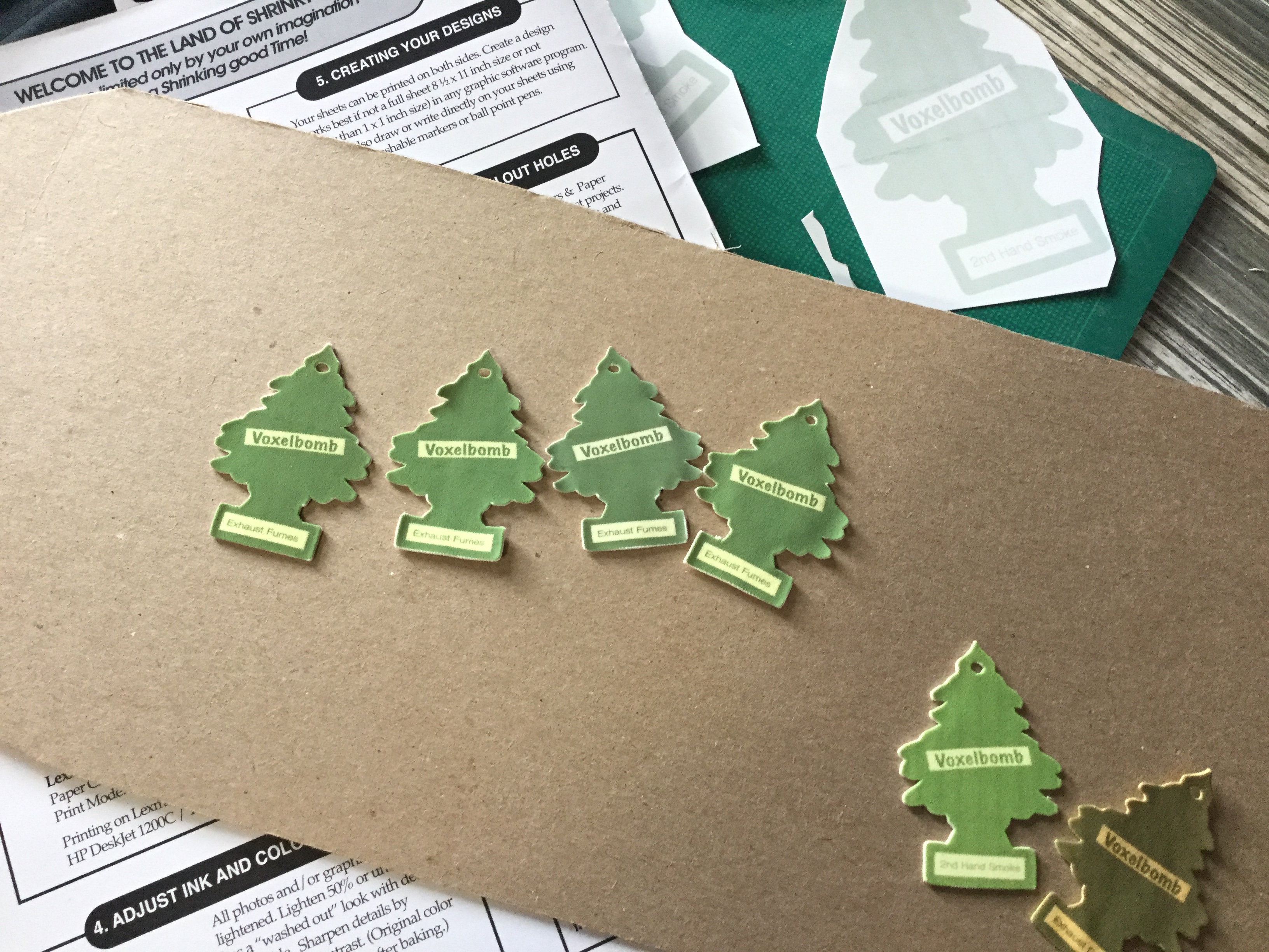 Making and baking some custom air freshners. First, I tried the real ones but were too strong smelling and a little bit too big. I grabbed some inkjet printer Shrinky Dink paper, figured what size I needed, then printed following their directions.