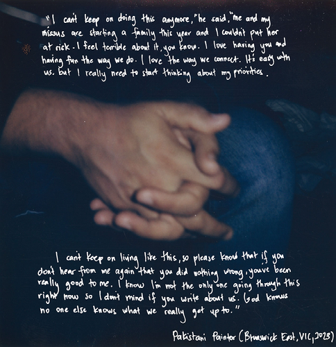 Krulic, T., Brown, G., Graham, S., McCarthy, A., & Bourne, A. (2024). ‘Stepping out of secrecy: Heterosexuality, quality of life, and experiences of HIV peer navigation in Australia.’ Culture, Health & Sexuality, 26(10), 1285–1300. https://doi.org/10.1080/13691058.2024.2308667