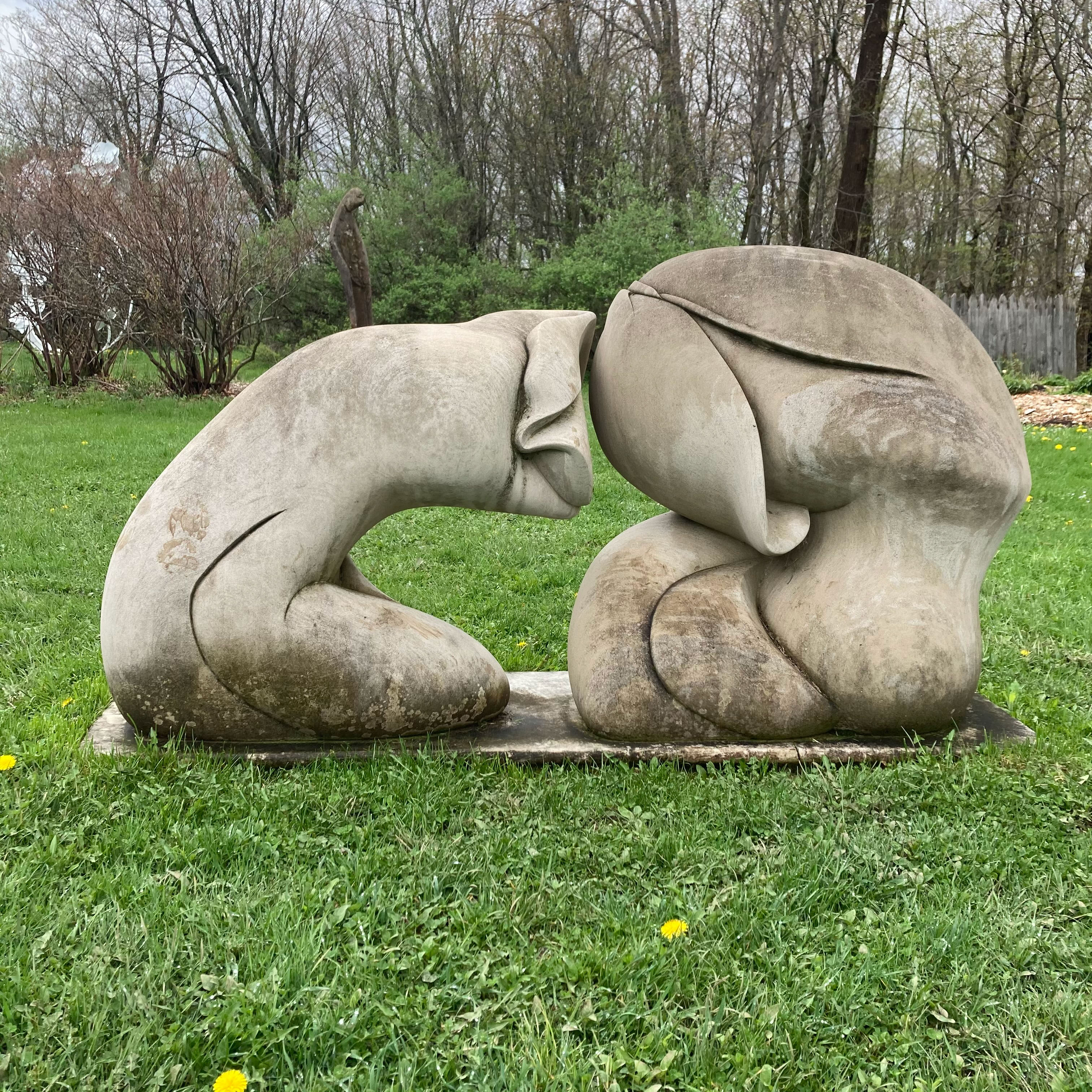 Gillespie, a ceramic artist, picks titles for his sculptures that are playful in nature. Ambiguous can suggest uncertain, confusing, or unequivocal. Unbalance suggests distortion, destabilization, or to throw into disarray. The work was discovered by Joel Potash and Sandra Hurd while Gillespie was exhibiting the work at SUNY Fredonia. Each winter, the ceramic vessels are removed and stored indoors.