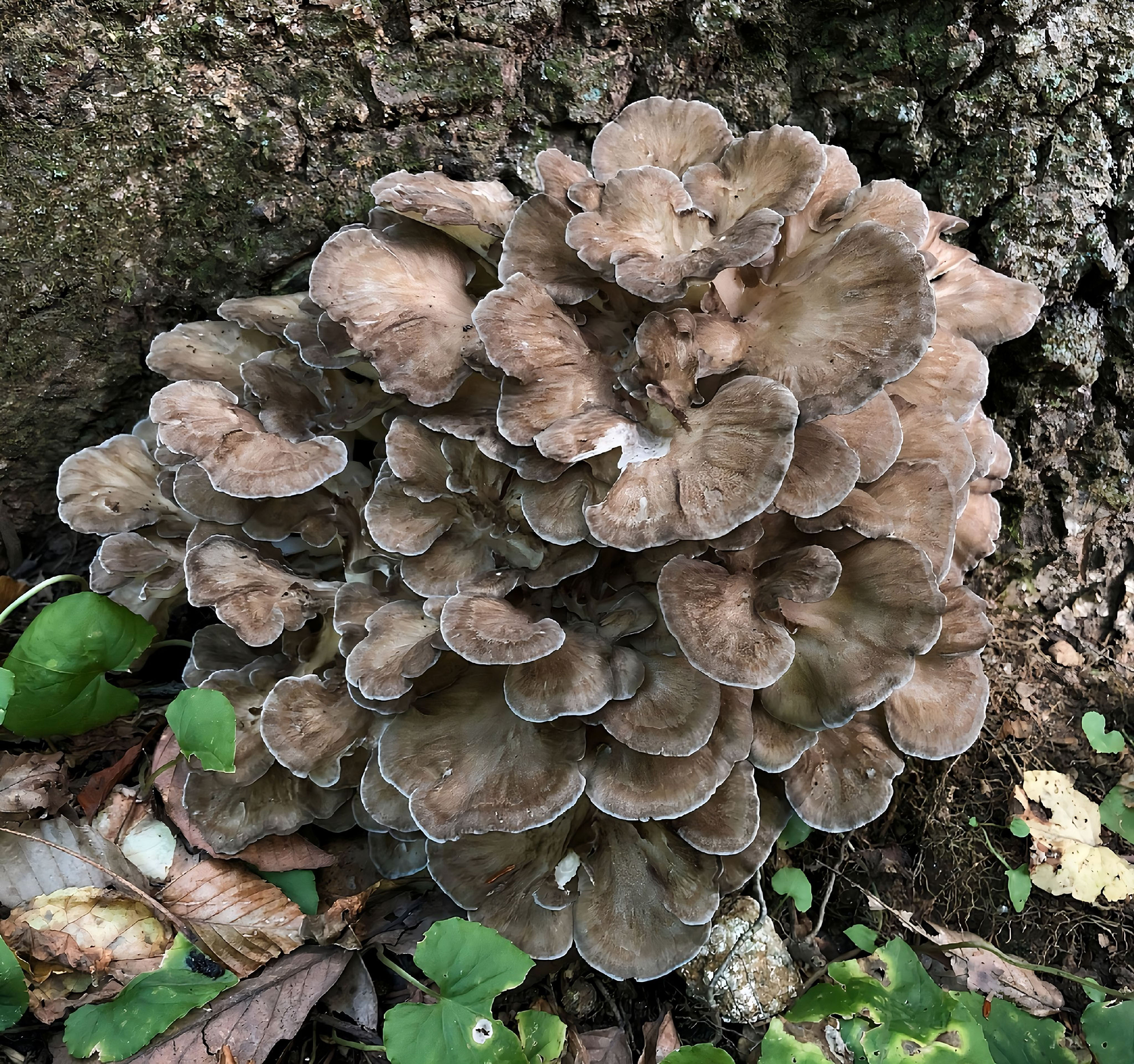 Descripción Grifola frondosa (Dicks.) Macroscópicamente presenta basidiocarpos anuales, de grandes dimensiones (de 40-50 cm de ancho, incluso hasta 1 m de diámetro) que pueden alcanzar varios kilos de peso (hasta 18-20 kg) y que se desarrollan en la base y tocones de los árboles. Los basidiocarpos están ramificados y formados por un gran número de pequeños sombreros de unos 8 cm de diámetro, en forma de abanico, que se encuentran imbricados.