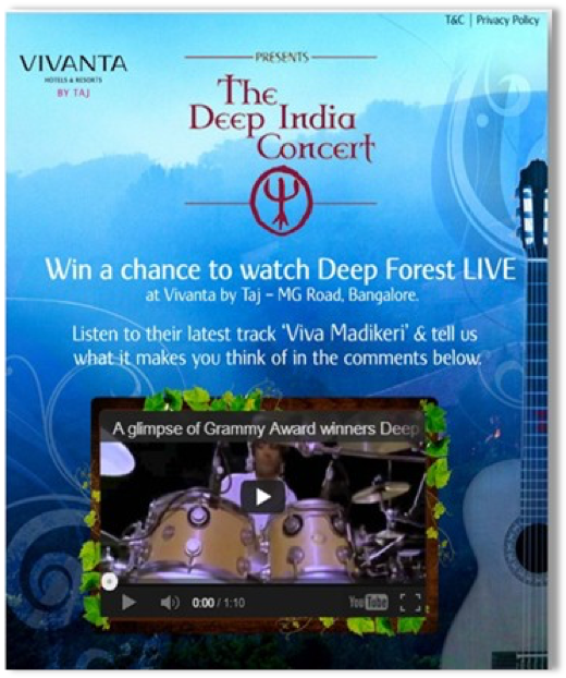 Often destinations need to find their own tune, and especially Coorg which has its own rhythm as a destination. We initiated the Deep India project with Sony Music and got two time - Grammy winners Deep Forest to perform live at the rainforest and compose a custom track Viva Madikeri which hit the top notes on Apple itunes. And finally wrapped it up with conceiving and producing a “Secrets of the Forest” integrated campaign and film. With tons of global awards and listings, record revenues and one of the highest ADR in the country, the rainforest had finally checked in and the Taj Coorg has never looked back. For us this was an experience that was as rich as the forest.