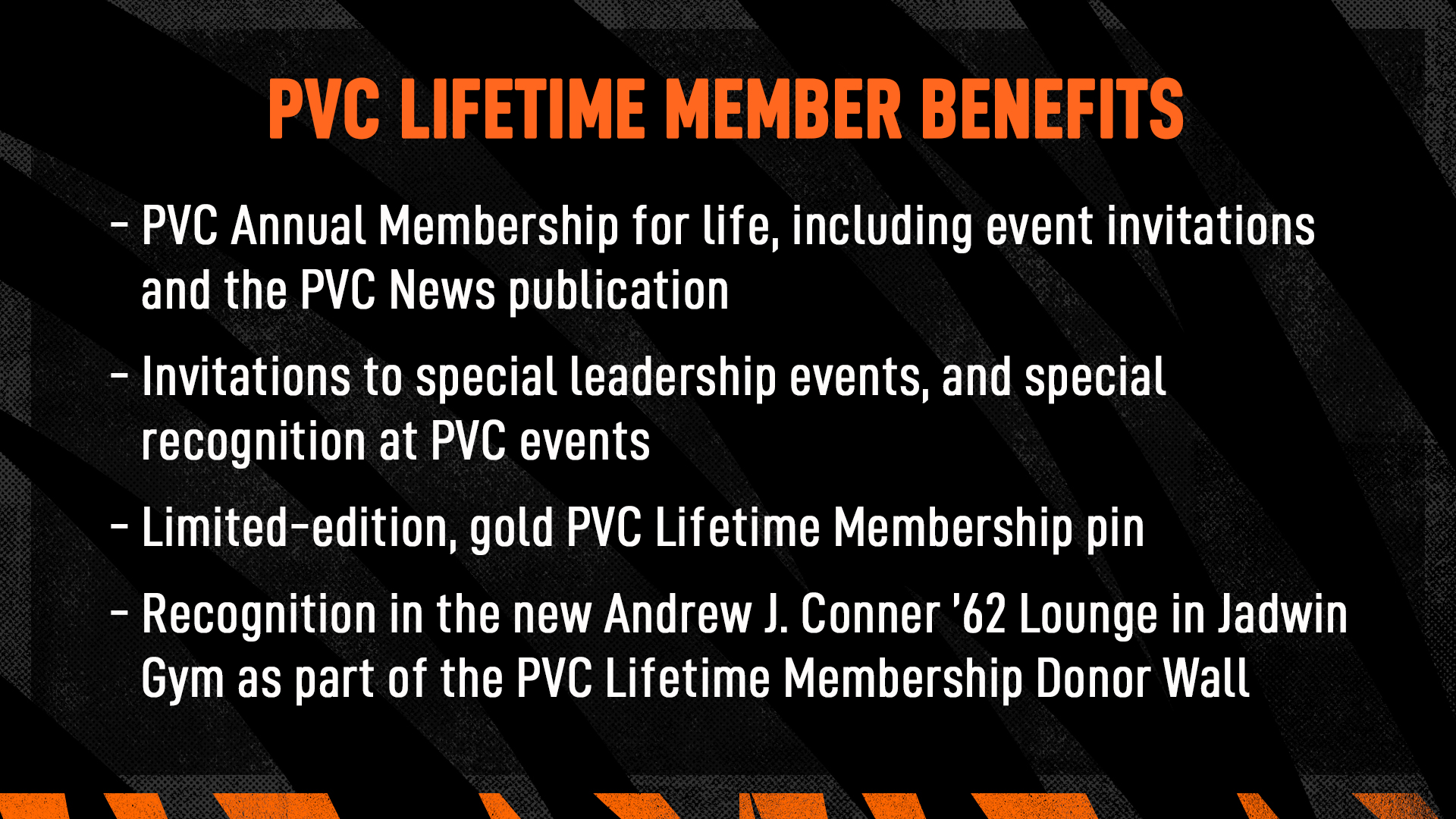 In addition to supporting core PVC programming - including Tigers in the Community, PVC Varsity Weight Room, Gary Walters '67 PVC Awards Banquet and Alumni Engagement gatherings and special events, to name a few - the PVC Lifetime Membership program provides critical financial flexibility to the Ford Family Director of Athletics to help address the department's top central priorities and further enhance the Princeton student-athlete experience for all.