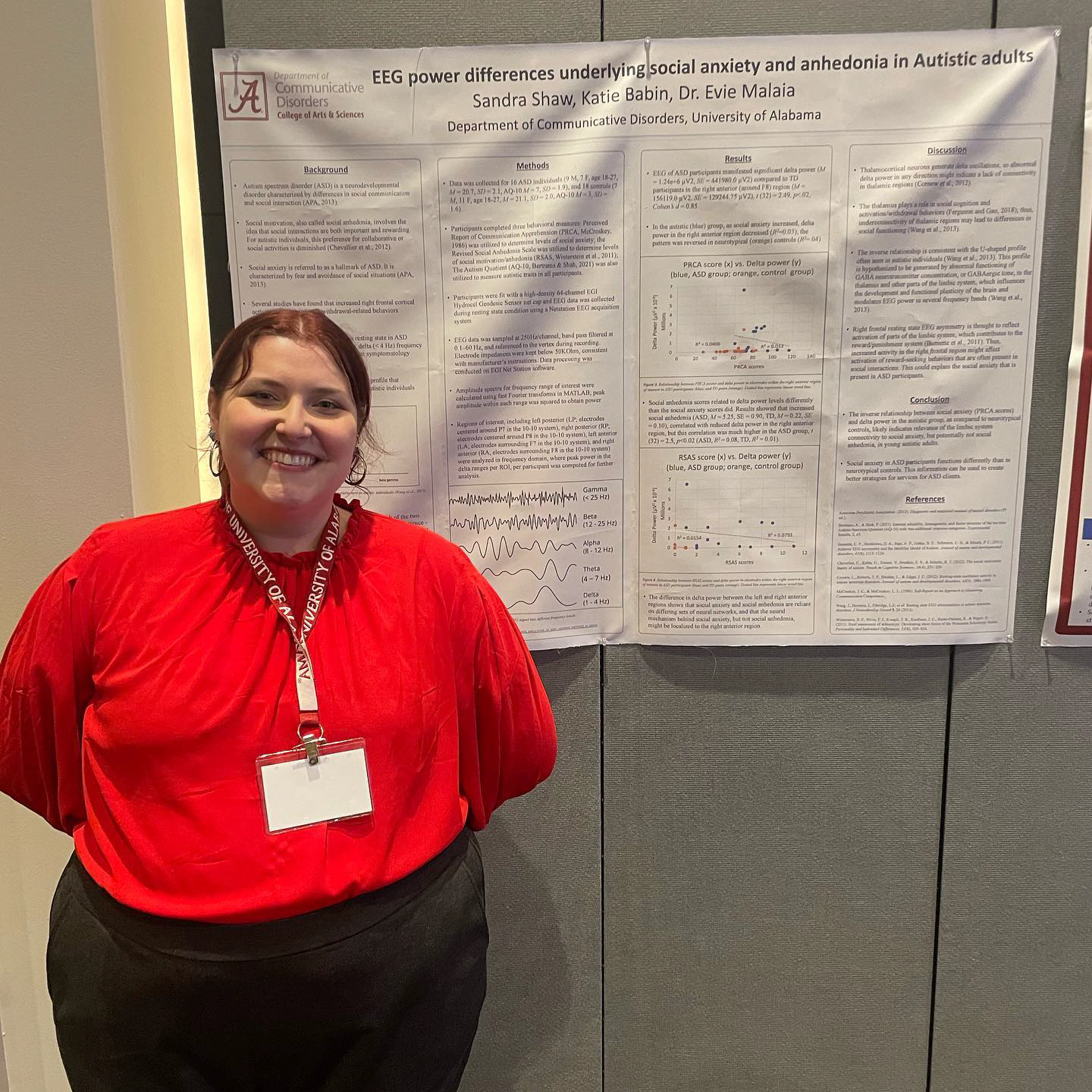 - Shaw, S., Babin, K., Malaia, E. (February 24, 2023) EEG power differences underlying social anxiety and anhedonia in autistic adults. Poster presented at the 22nd Annual Alabama Autism Conference, Tuscaloosa, AL.