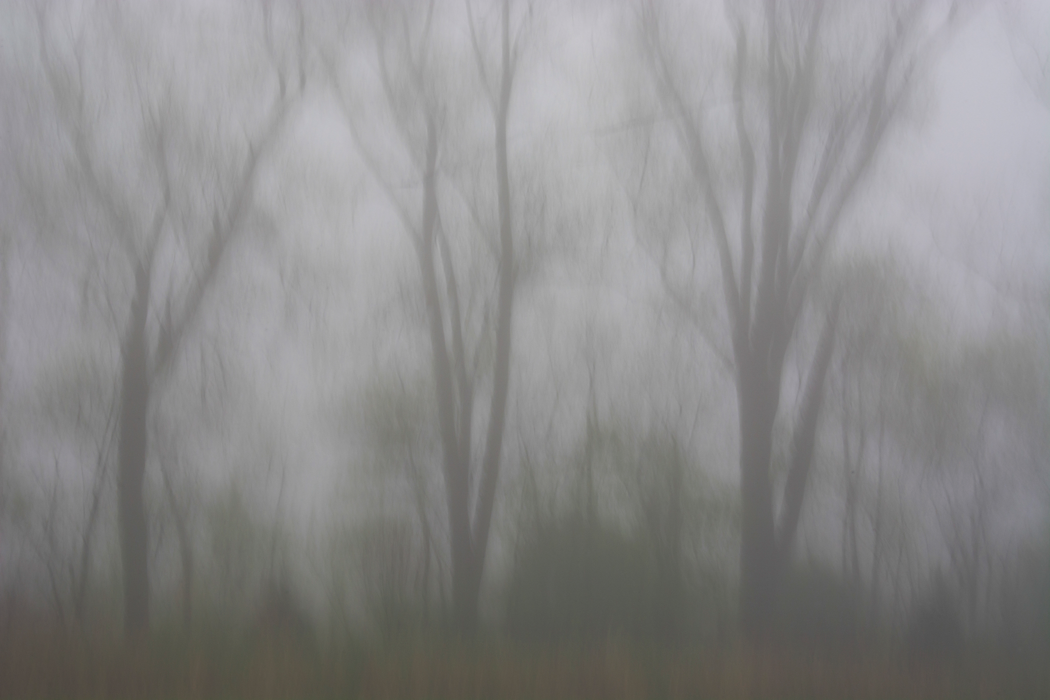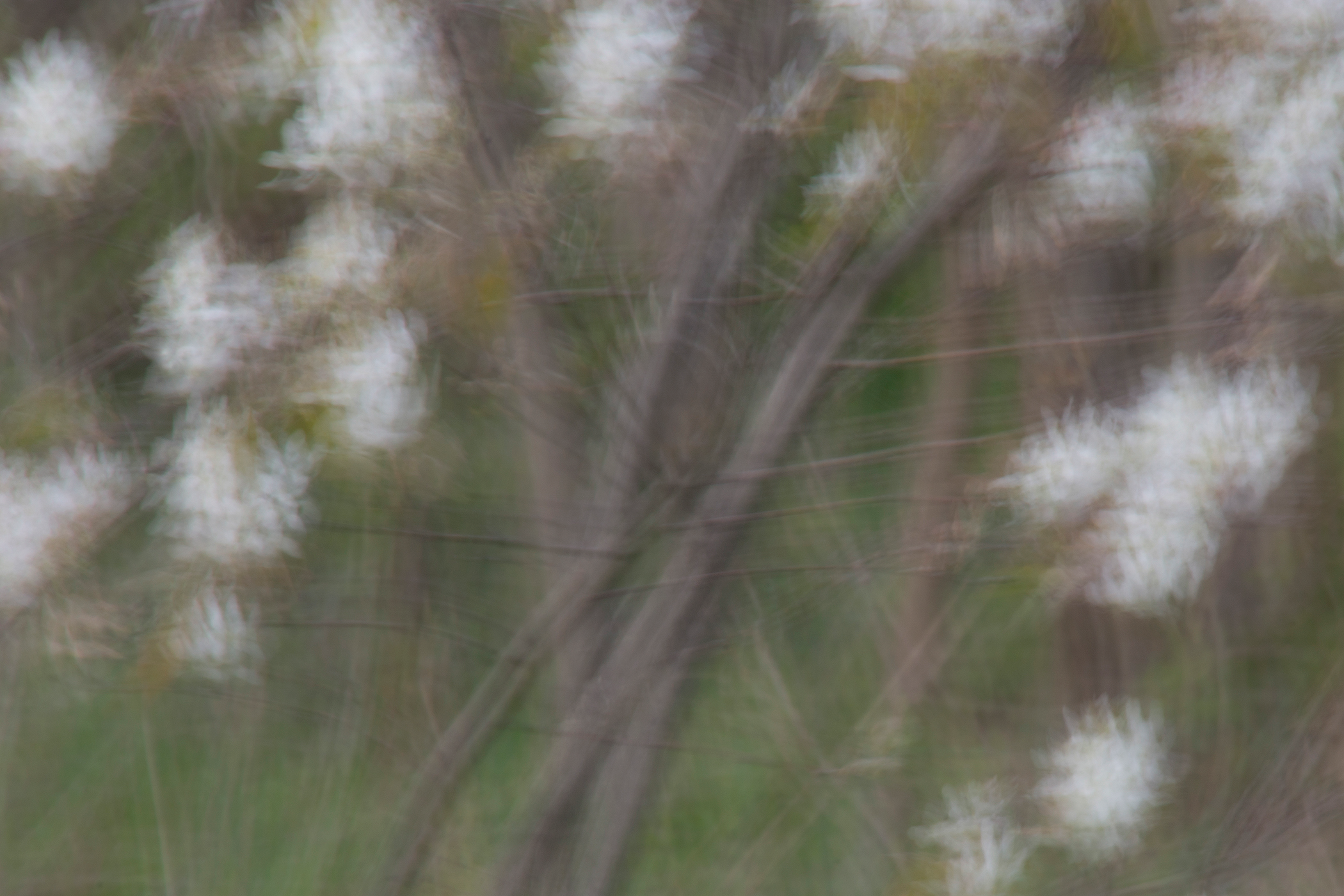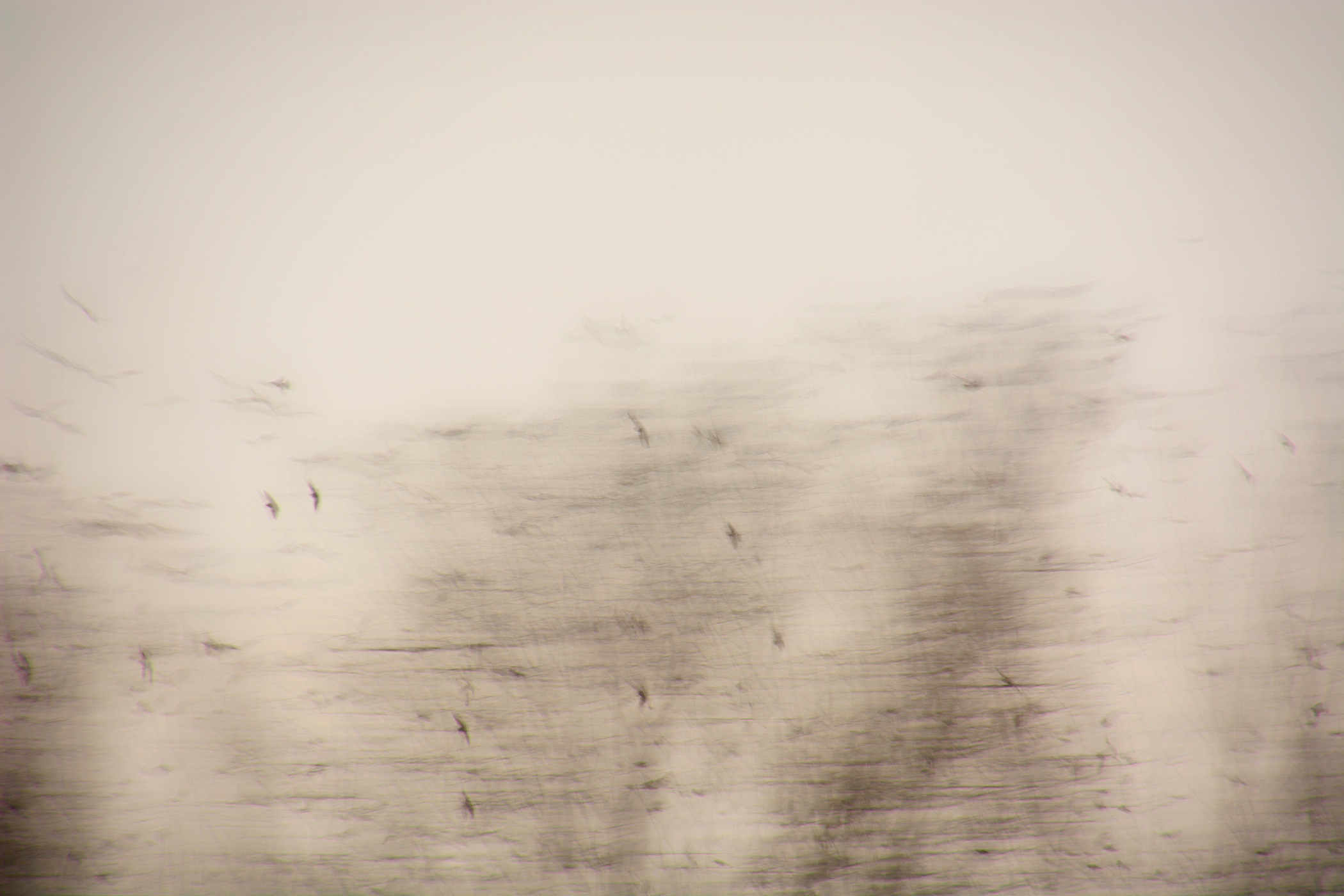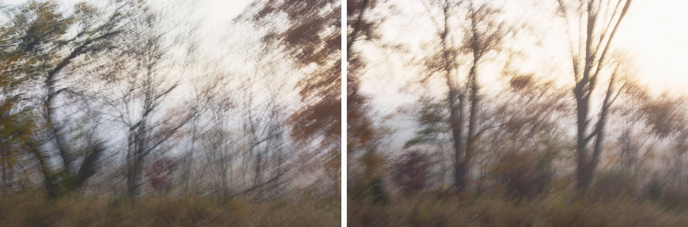 Soon I was photographing in the habitat just behind where I live: a small catchment basin, foxtail grasses, a dancing row of hickory and mulberry trees, a galaxy of birds, and farm fields reaching toward the distance. Allowing my animated hand to direct the camera and shooting with a slow shutter in four seasons, I simply gave my shaking its due.