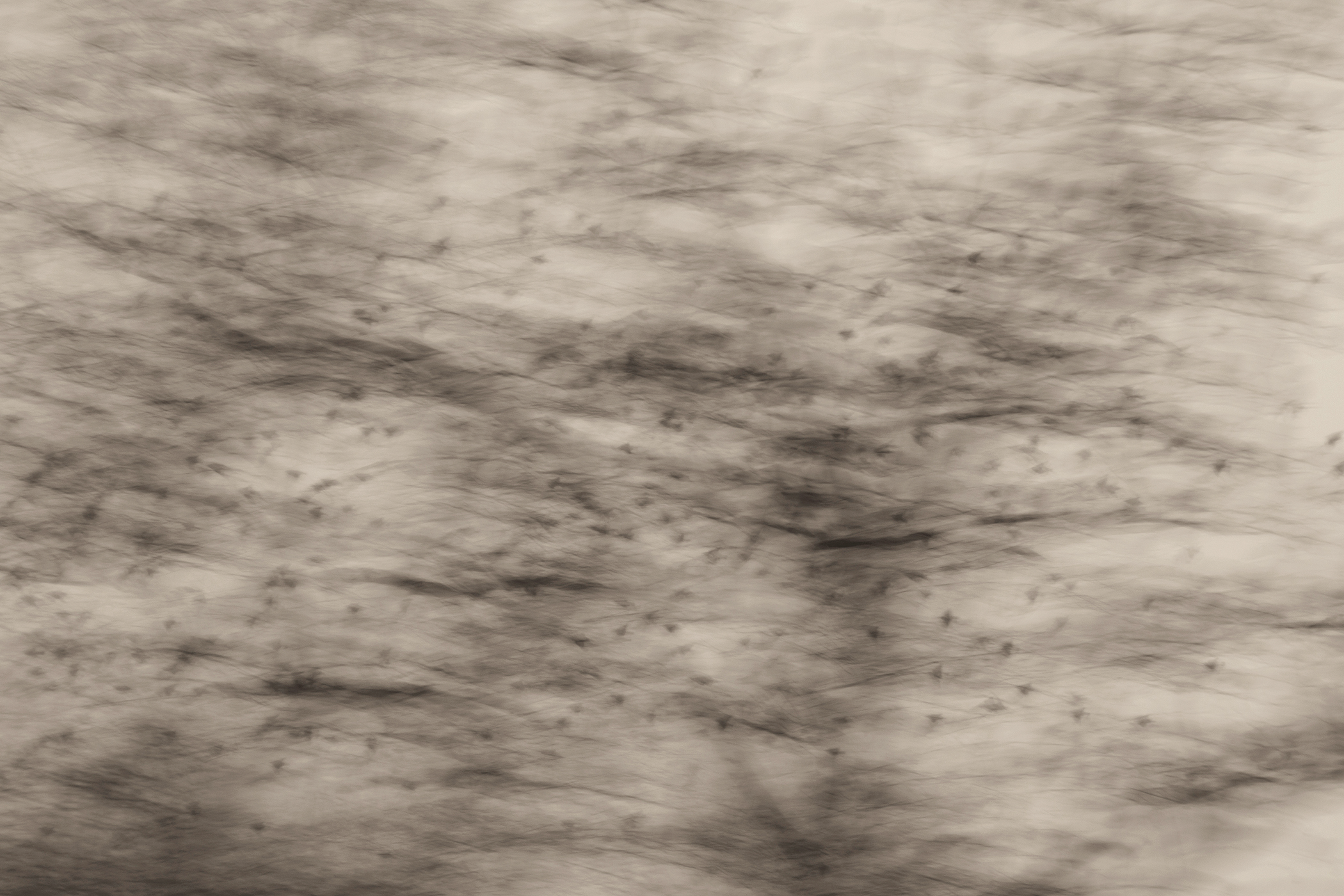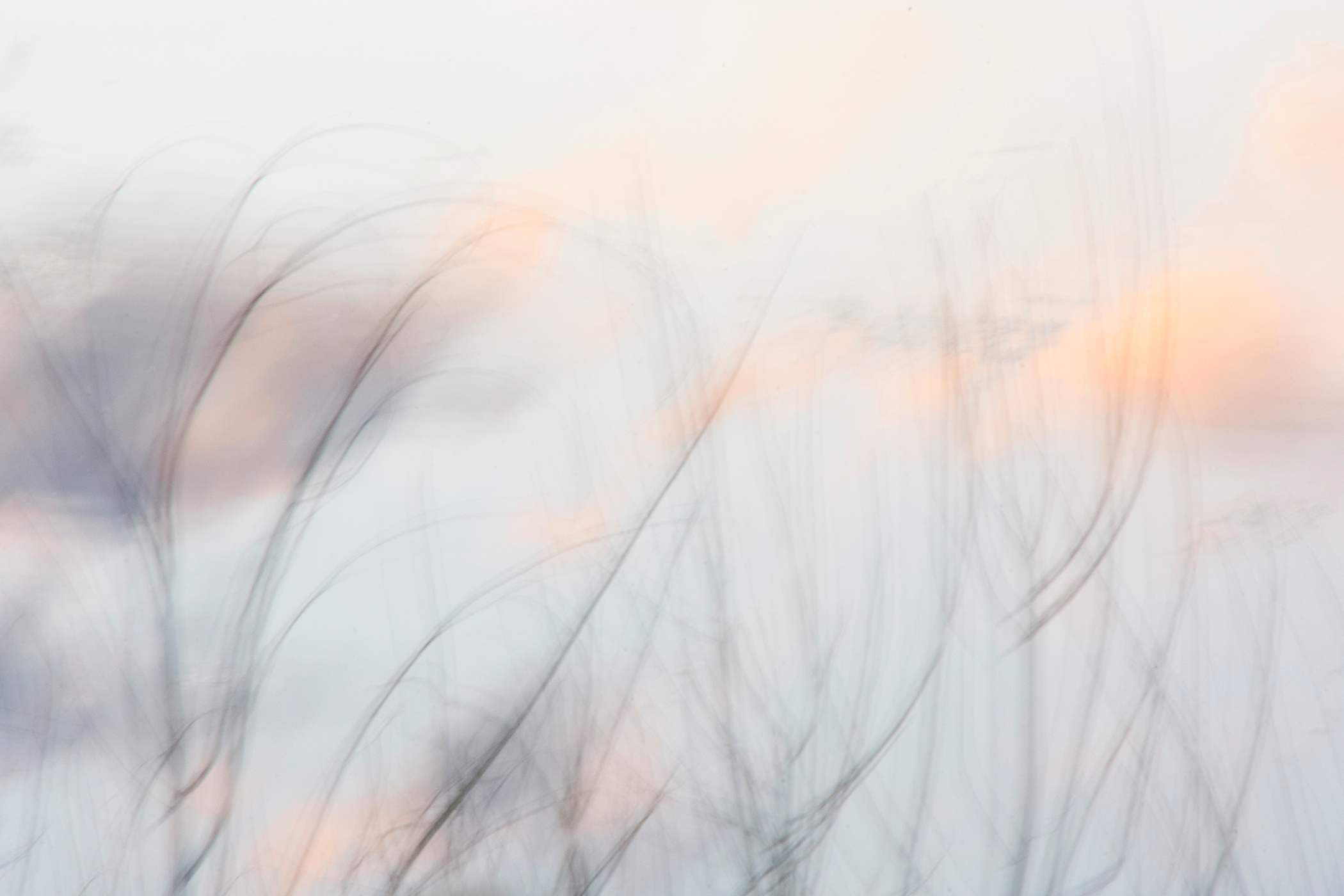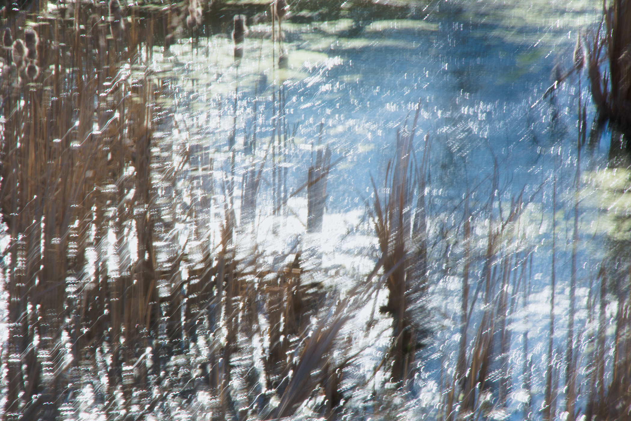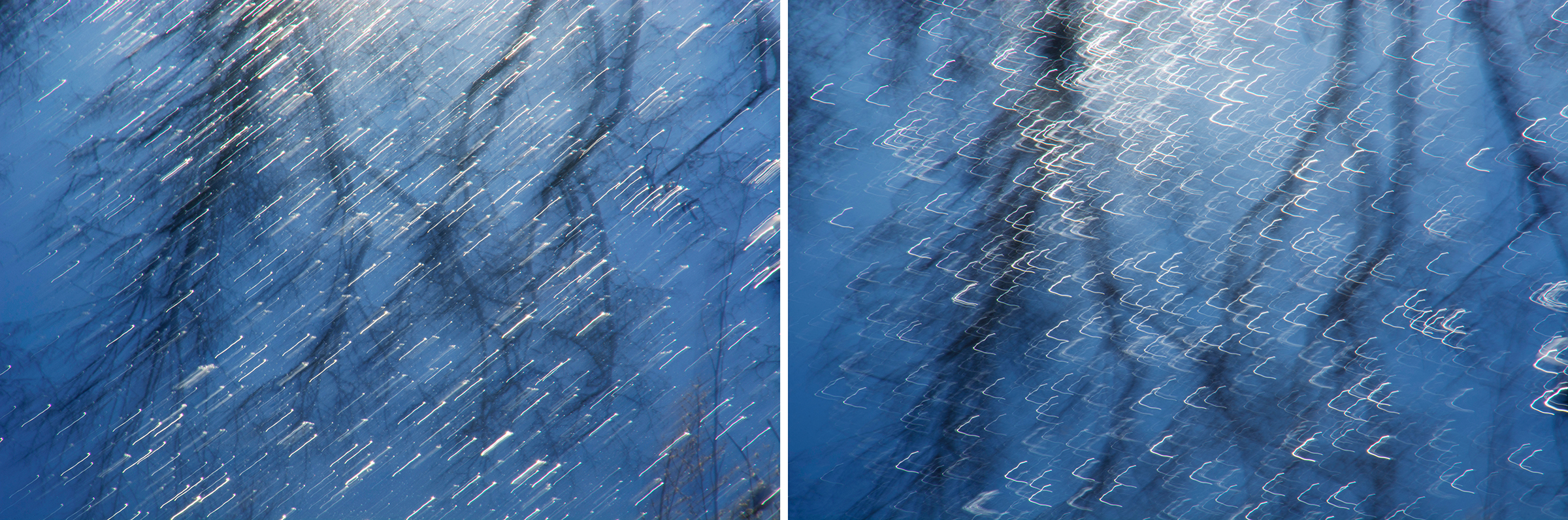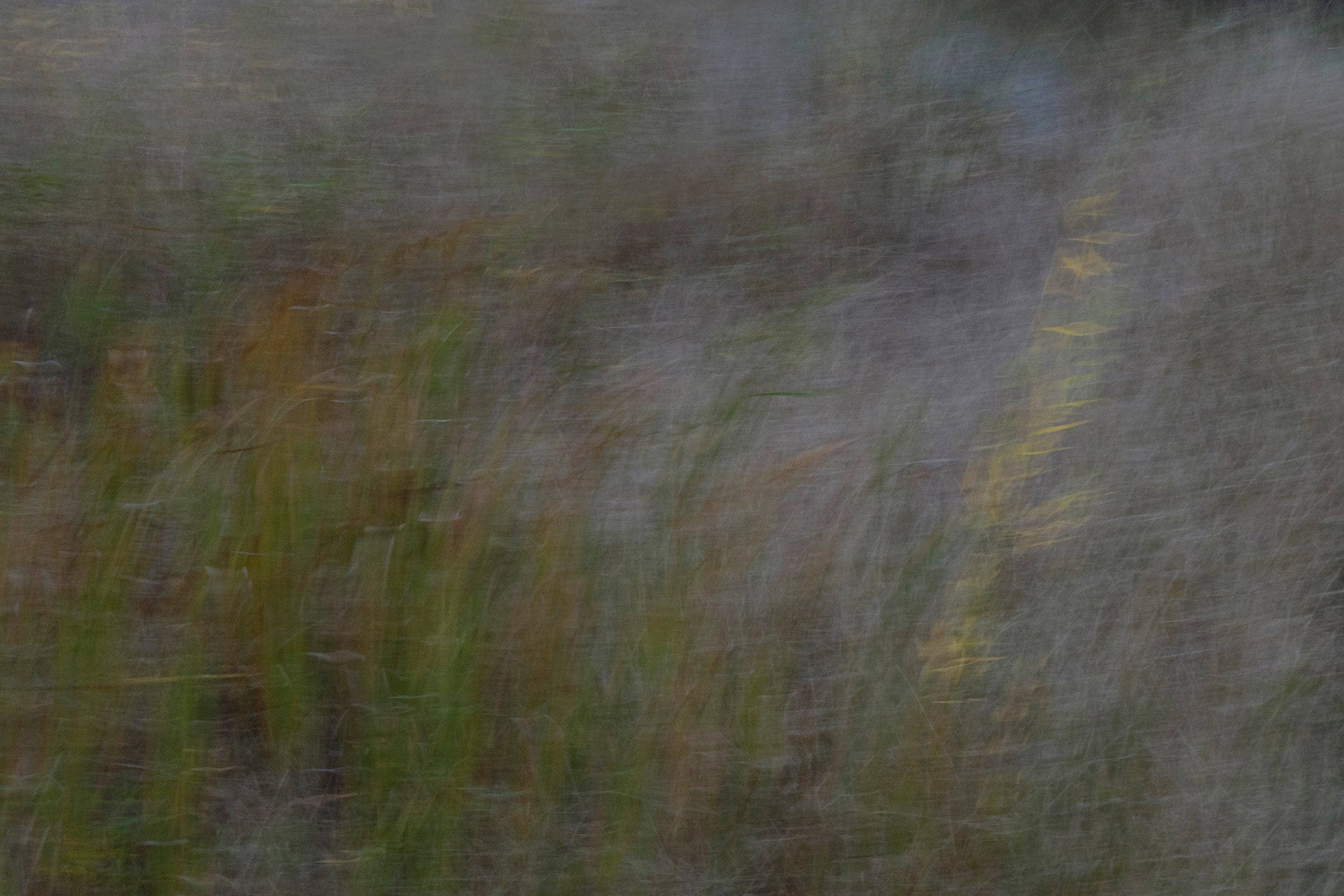 Soon I was photographing in the habitat just behind where I live: a small catchment basin, foxtail grasses, a dancing row of hickory and mulberry trees, a galaxy of birds, and farm fields reaching toward the distance. Allowing my animated hand to direct the camera and shooting with a slow shutter in four seasons, I simply gave my shaking its due.