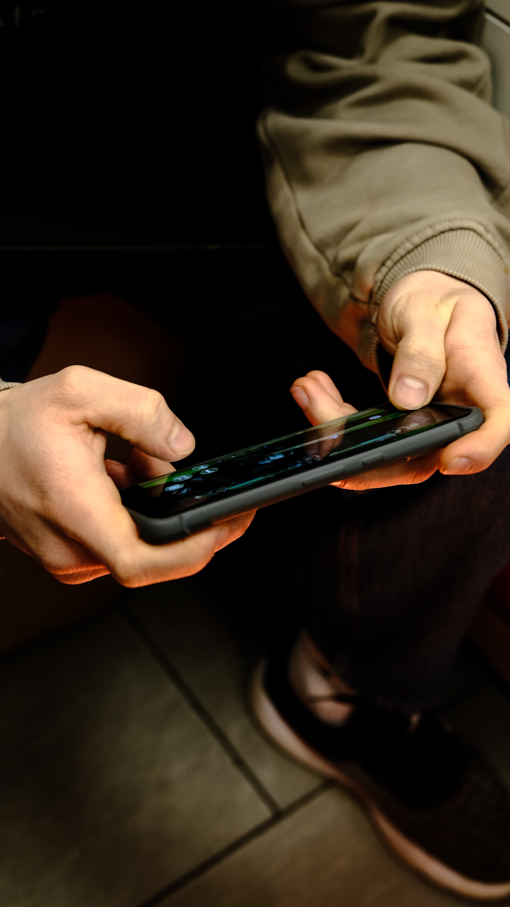 Created with an image by Babenko - "young man playing mobile game with rapid finger movements, hands illuminated by warm soft lighting, captured from a top-down view, showcasing an intense and focused gaming moment in a cozy atmosphere"