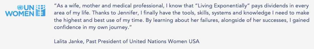 As the author of the Amazon best-selling book Living Exponentially: Unlocking the Potential of Every Moment in Your Business and Life, Jennifer finds joy in sharing her lessons learned with aspiring business leaders and entrepreneurs. Through BExponential, LLC, she is on a mission to engage over 2,000 women in an online community, providing collaborative content and events to help families achieve joy and success simultaneously.