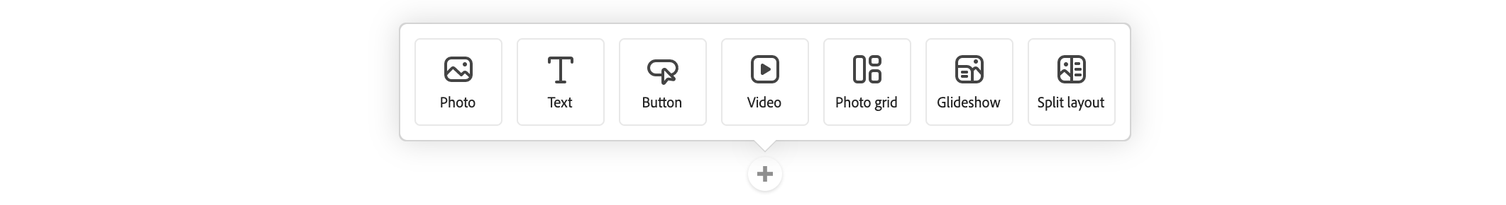 click the + button > choose either Button, Video, Photo grid, Glideshow, or Split layout