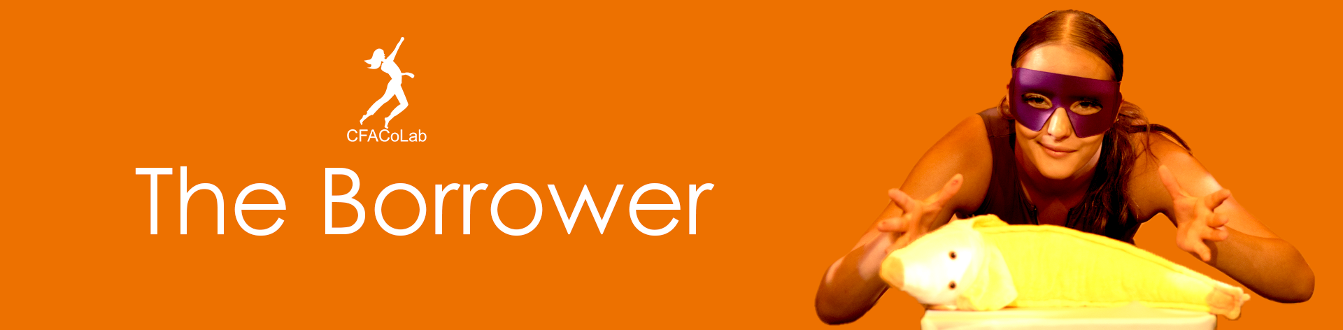 The Borrower is a stealthy, slinky, spy-like, taker of things. She wears a purple mask to disguise her identity. A constant tip-toer, she wonders what work of art she should steal from the gallery.