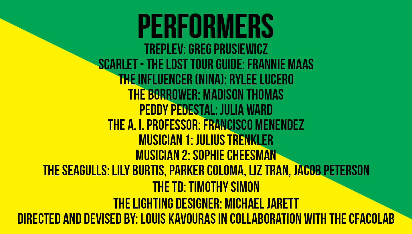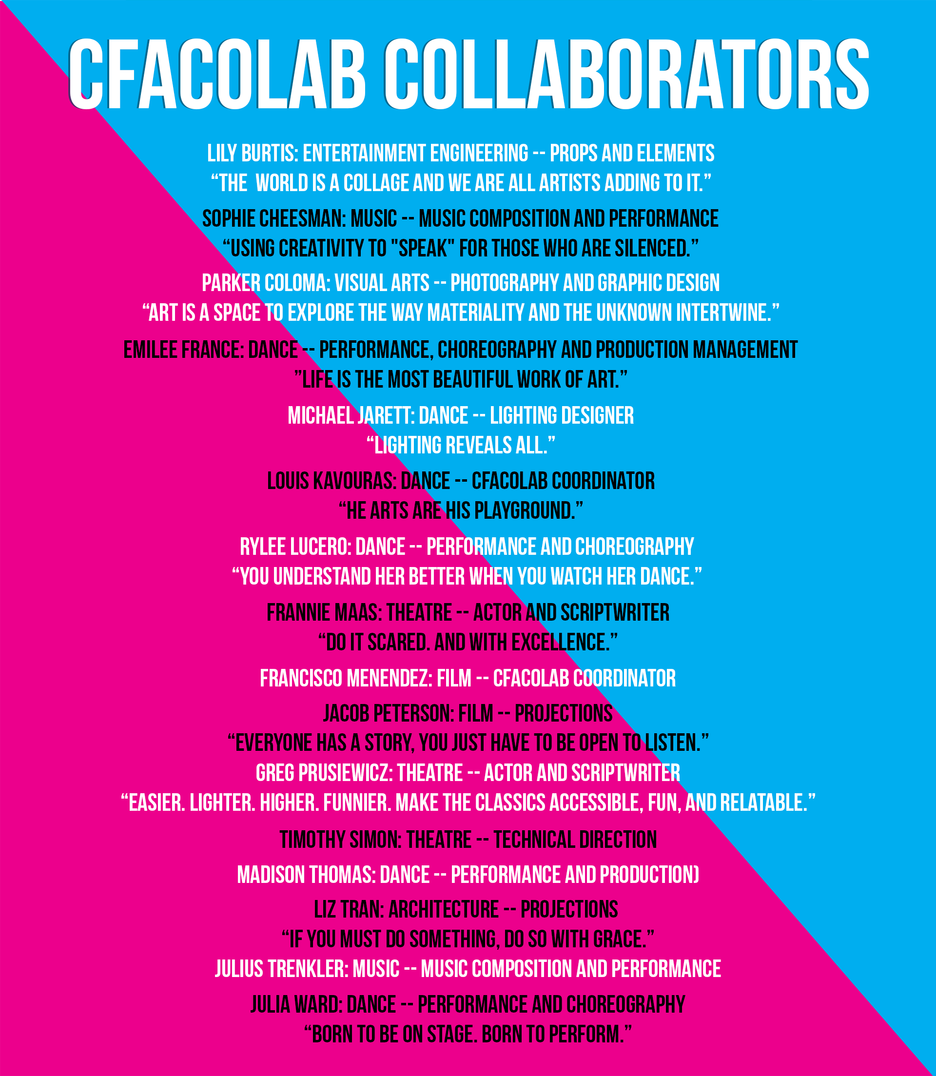 The CFACoLab is a performance group of actors, dancers, composers, visual artists, and designers from the University of Nevada Las Vegas College of Fine Arts. The award winning five-star group begins with a single idea or image and devises the world of a show exploring aspects of art and design, through the various arts disciplines. CFACoLab has presented works in Scotland, England, Korea, Japan, and Australia.