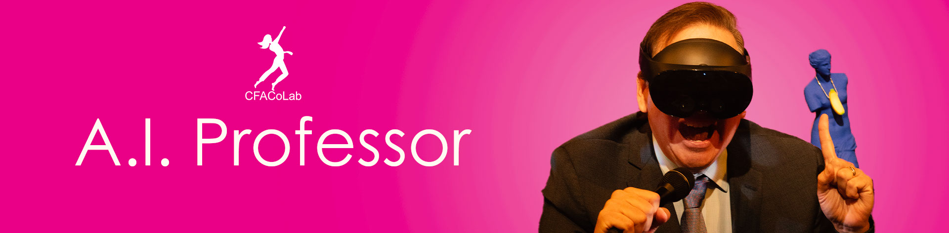 The AI Professor (Head on an Ipad on a stand): You are a wise professor of the world. You draw from all that is around you and create a new reality. You can reinvent yourself. When you speak, others listen. Creative Color: BLUE (LIGHT). Kindred Character: THE AI PROFESSOR.
