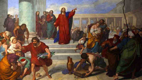 Si avvicinava la Pasqua dei Giudei e Gesù salì a Gerusalemme. Trovò nel tempio gente che vendeva buoi, pecore e colombe e, là seduti, i cambiamonete. Allora fece una frusta di cordicelle e scacciò tutti fuori del tempio, con le pecore e i buoi; gettò a terra il denaro dei cambiamonete e ne rovesciò i banchi, e ai venditori di colombe disse: «Portate via di qui queste cose e non fate della casa del Padre mio un mercato!». I suoi discepoli si ricordarono che sta scritto: «Lo zelo per la tua casa mi divorerà».