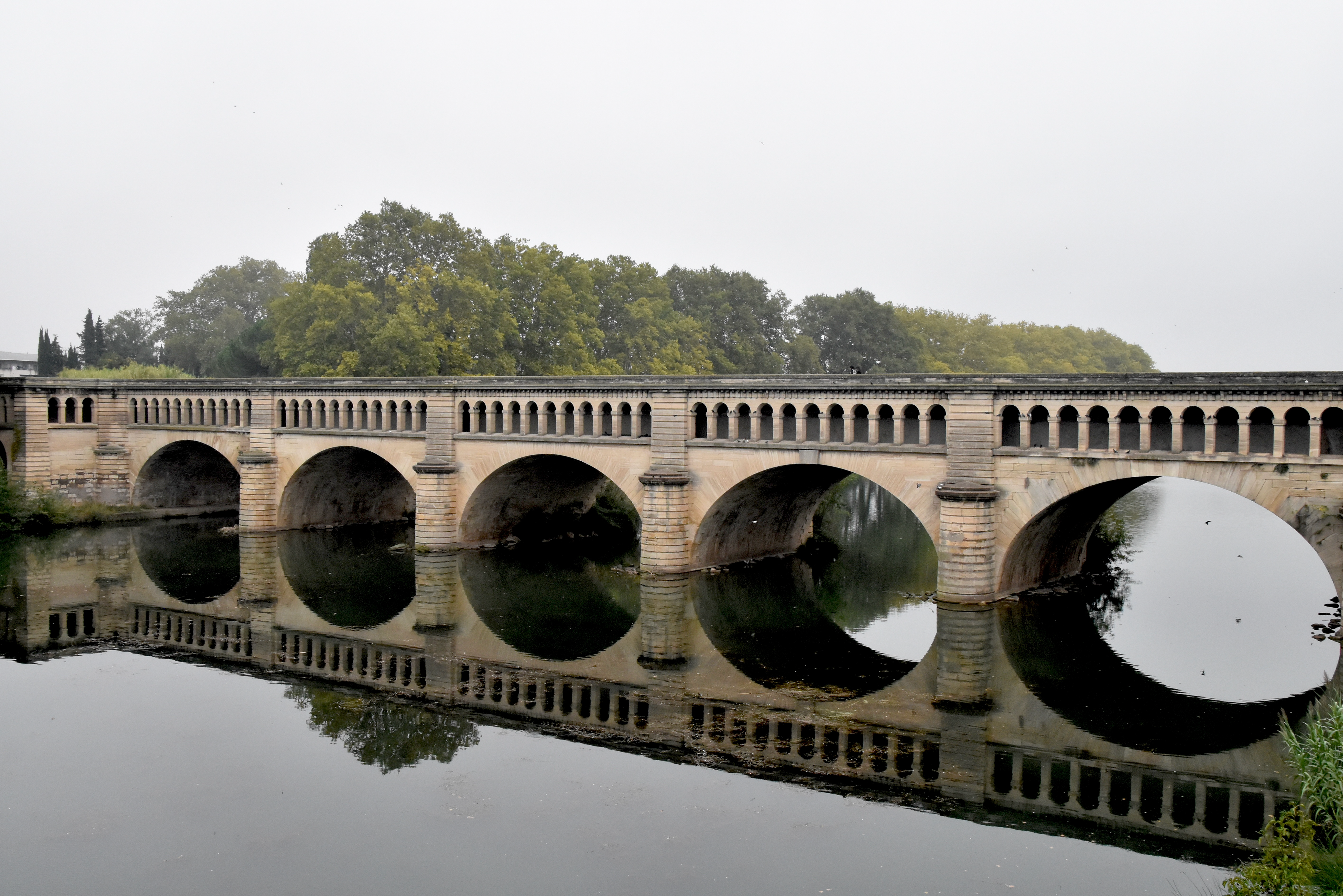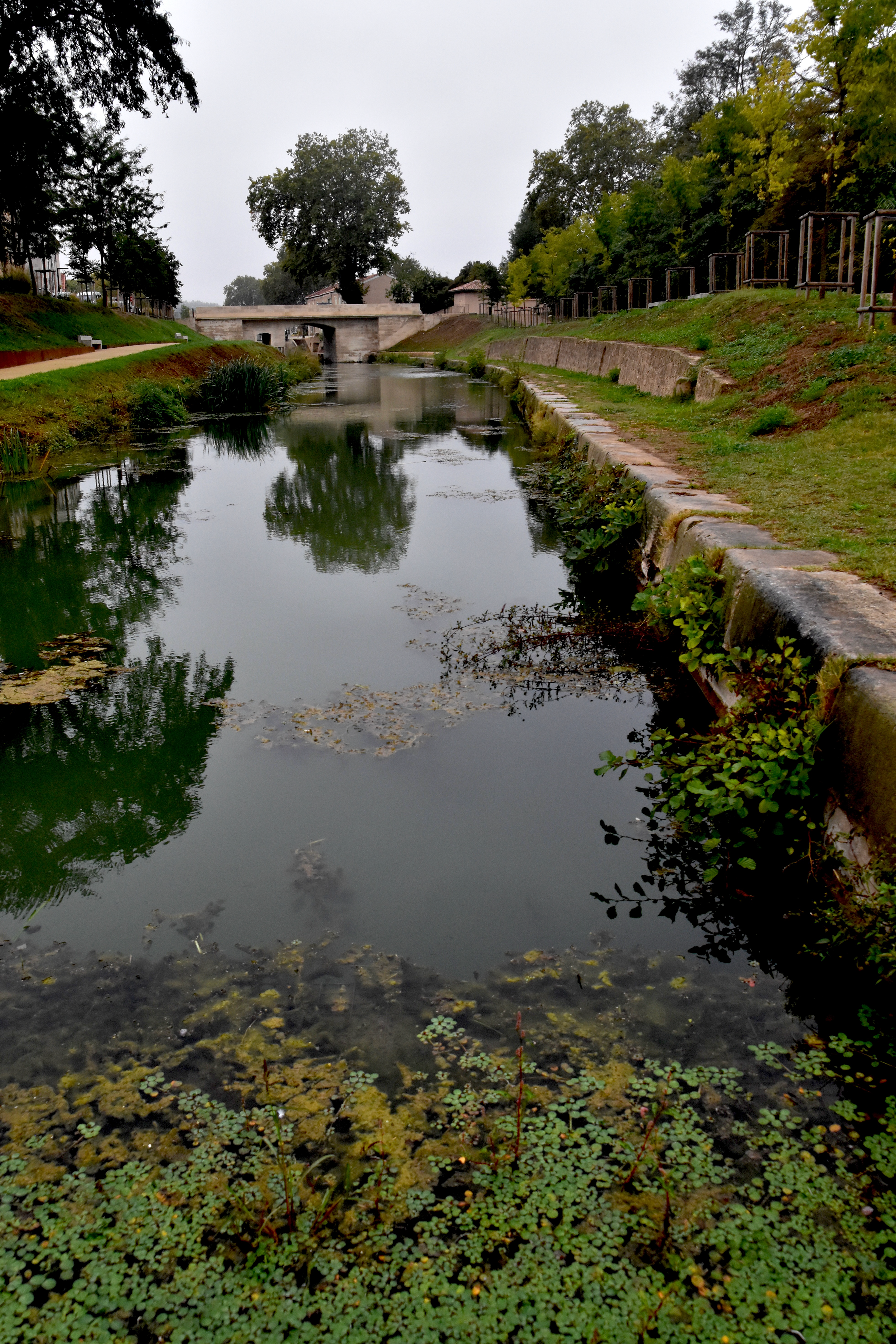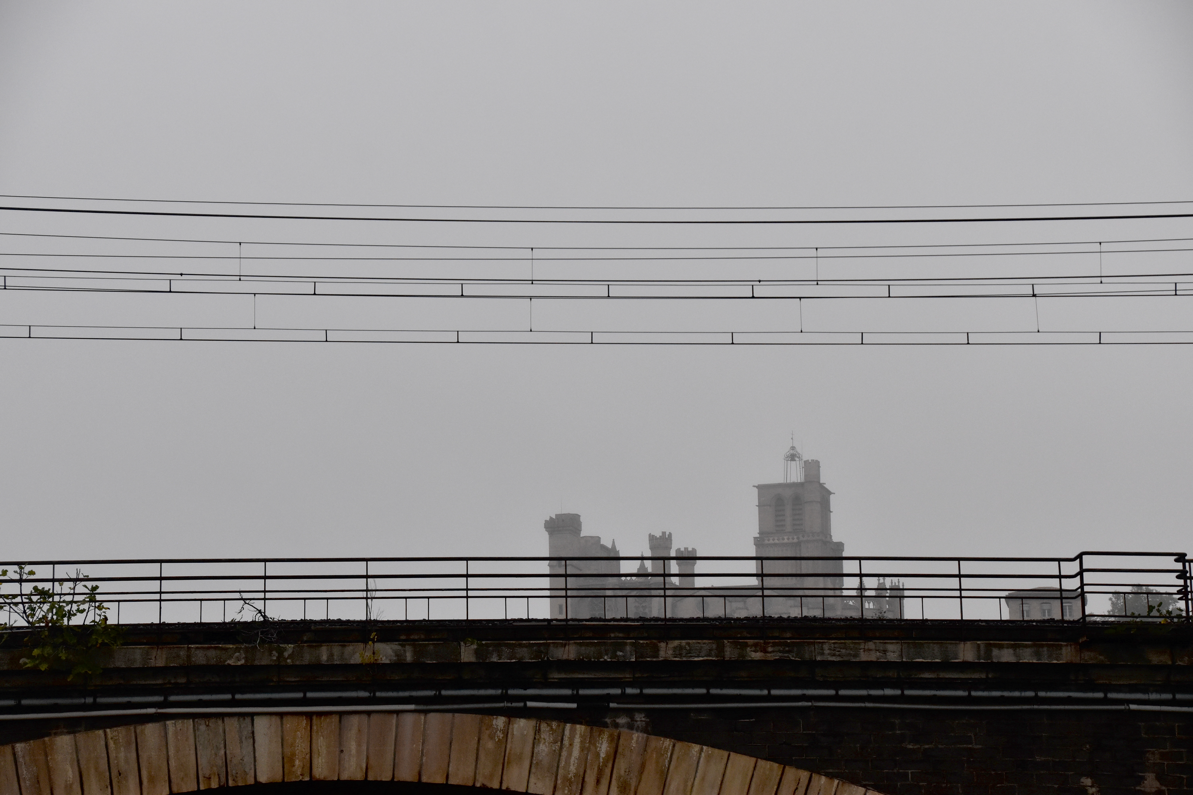Enchevêtrement de styles au sortir de Béziers, en haut, en arrière-plan, la cathédrale Saint-Nazaire et Saint-Celse, en bas à gauche le pont-canal sur l’Orb et à droite, un petit canal en contrebas du pont… le tout dans la grisaille du début de journée.