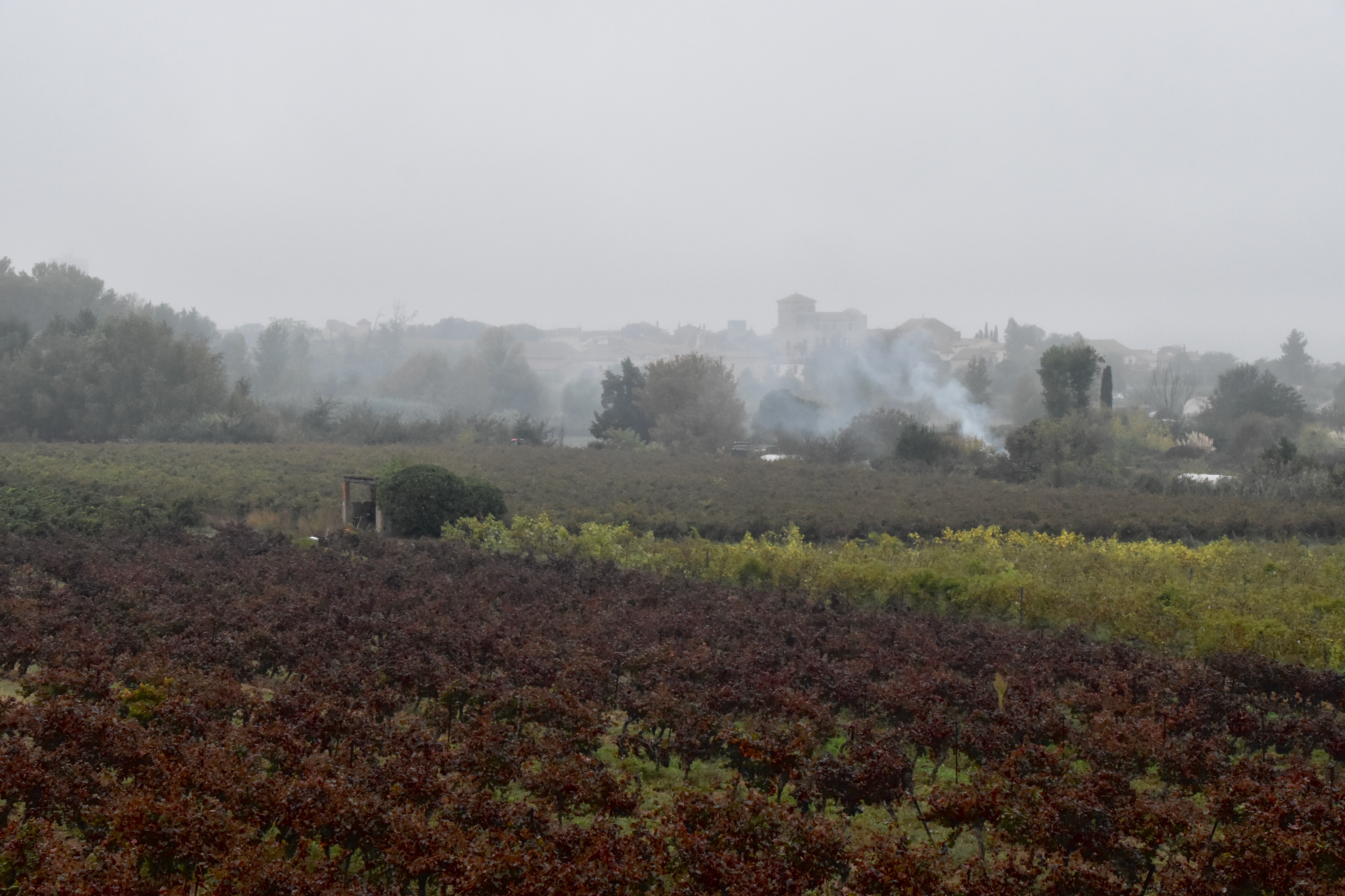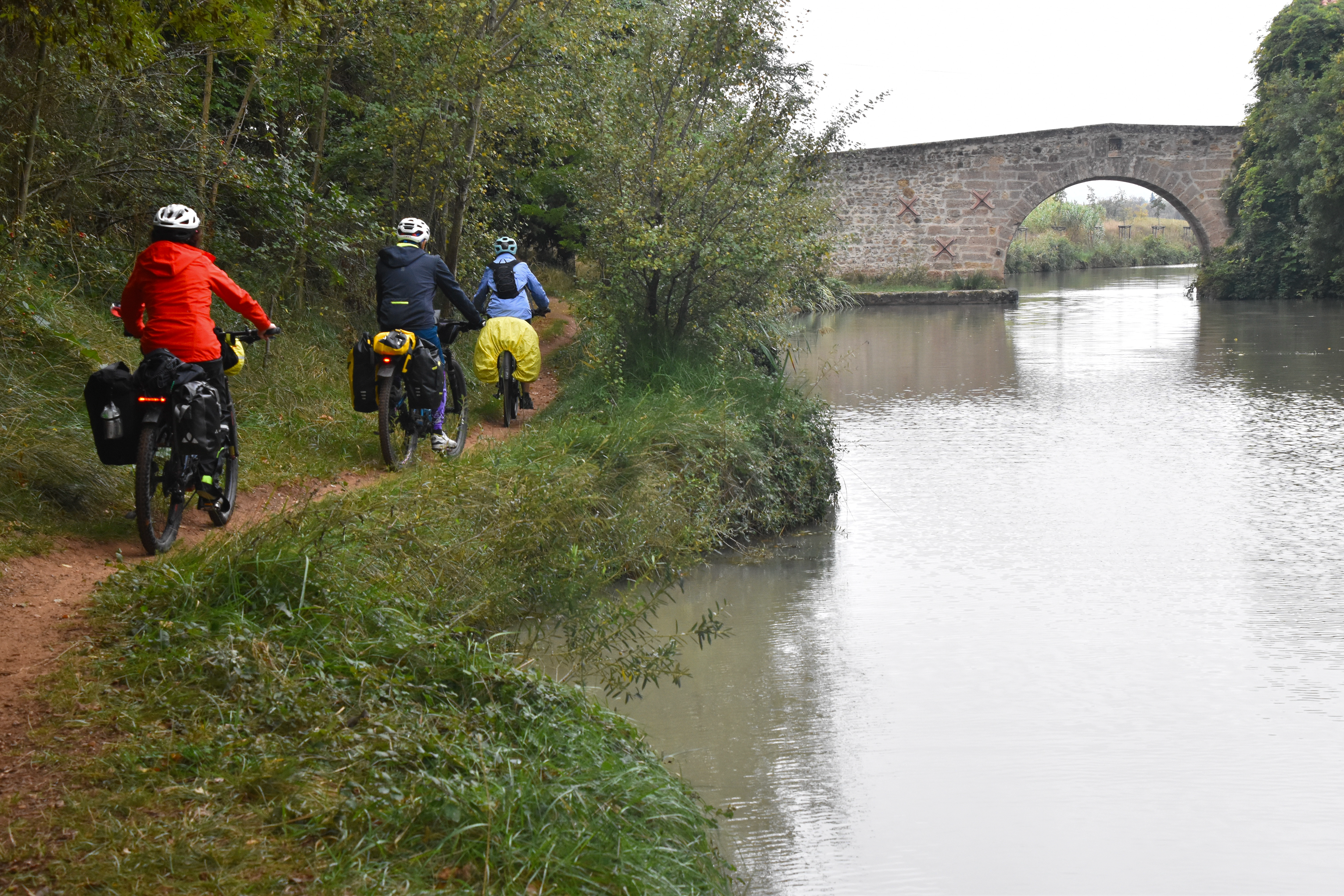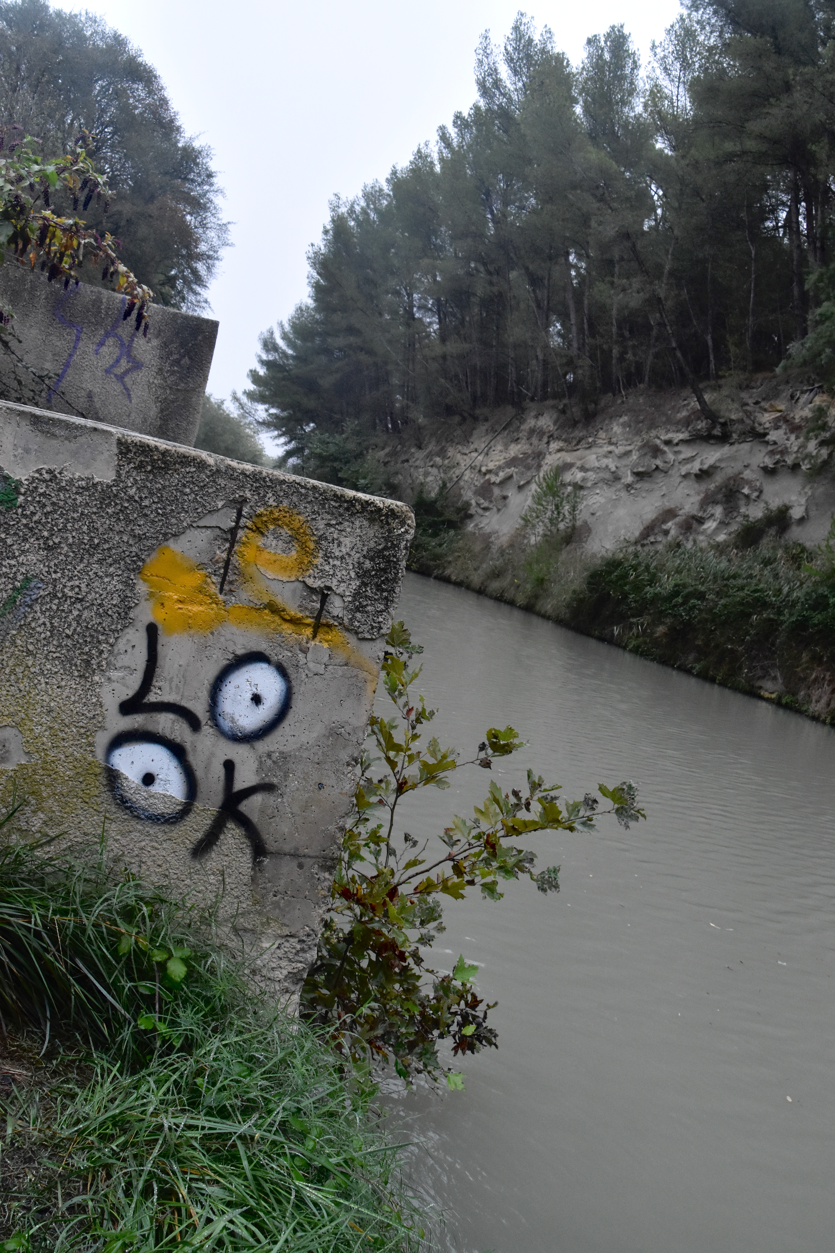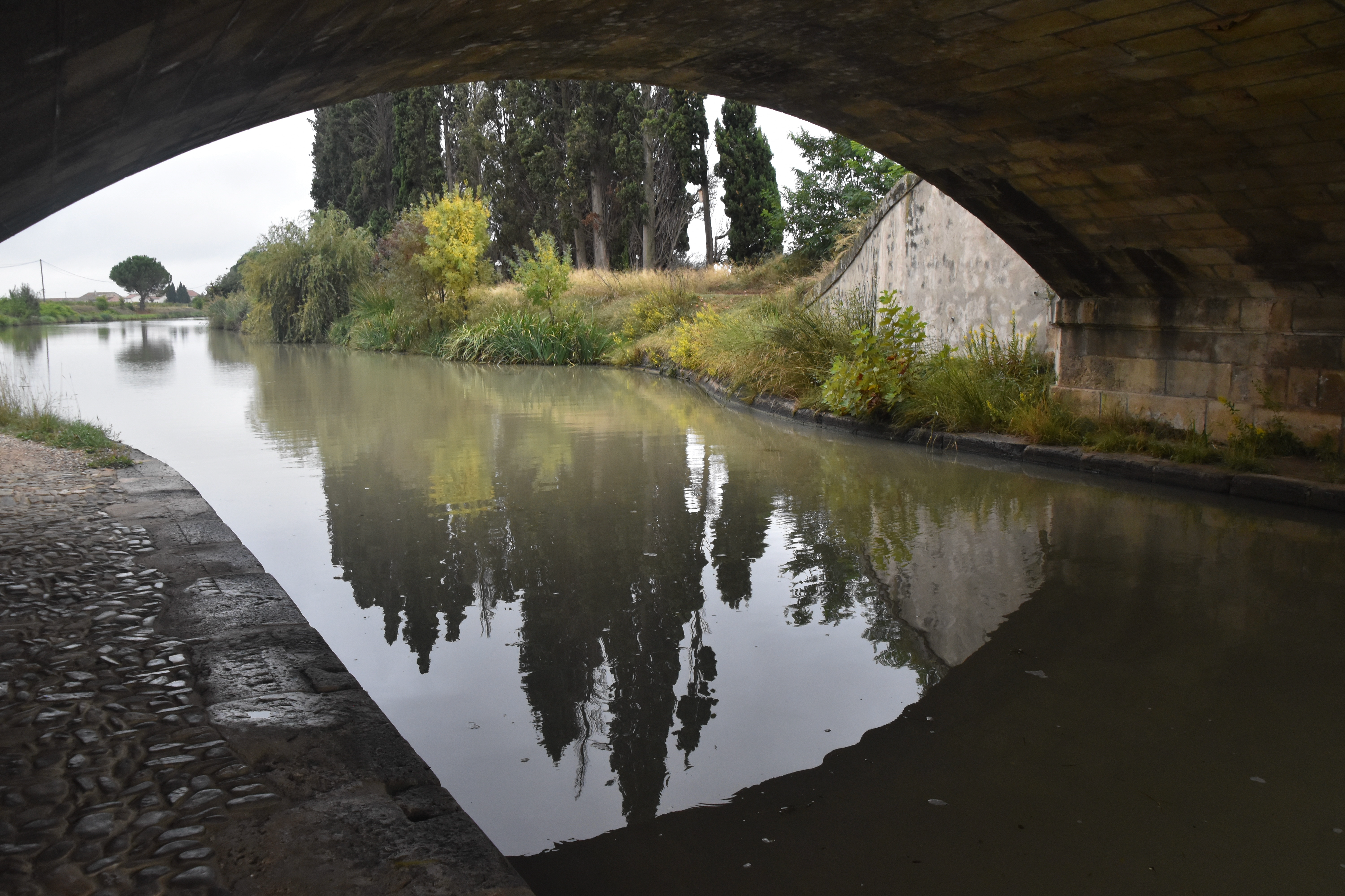 Enchevêtrement de styles au sortir de Béziers, en haut, en arrière-plan, la cathédrale Saint-Nazaire et Saint-Celse, en bas à gauche le pont-canal sur l’Orb et à droite, un petit canal en contrebas du pont… le tout dans la grisaille du début de journée.