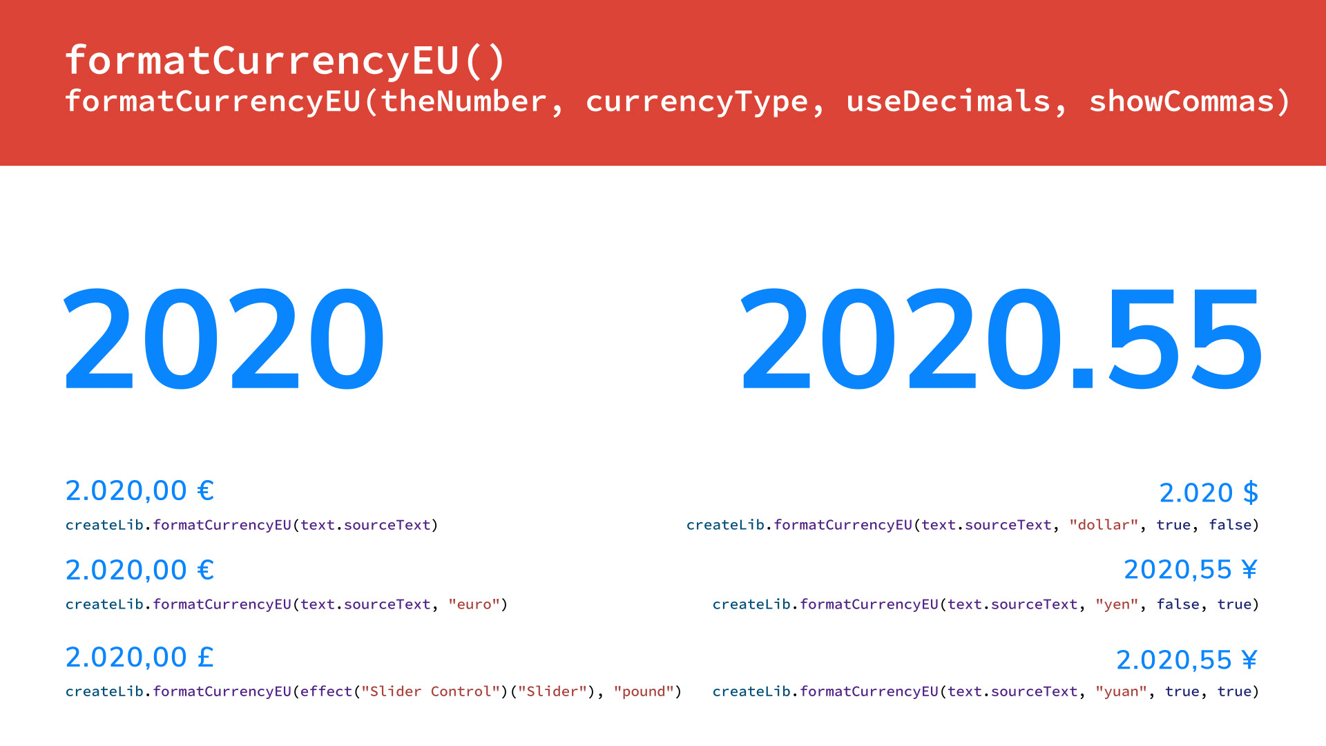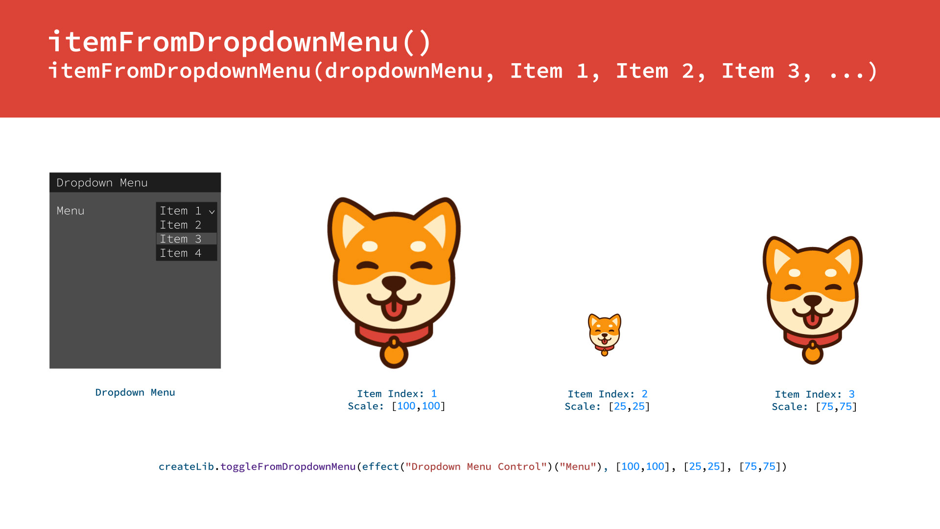 Individual Functions: adjustBrightness | adjustHue | adjustSaturationautoScaleAtTime | createDynamicMask | flipHorizontal | flipVertical | formatCurrencyEU | formatCurrencyUS | formatNumber | getCompSize | getLayerCorners | getLayerHeight | getLayerScale | getLayerSize | getLayerRotationgetLayerWidth | getPointOnLayer | getStyleOnly | getTextAndStyle | getTextOnly | itemFromDropdownMenu | keyframesToControllers | loopInOut | loopInOutPath | loopInPath | loopOutPath | retimeKeyframes | roundToWholeNumbers | selectCharacters | selectLines | selectWords | separateDimensions | setAnchorPointTo | setLineHeight | toggleFromDropdownMenu | toggleWithCheckbox | useTimeBetween