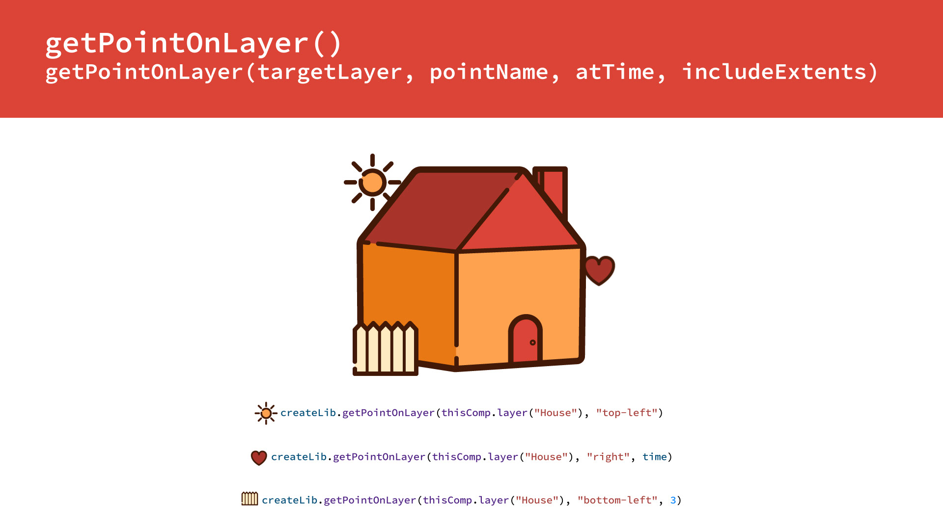 • pointName: a string that defines which of the nine points on the layer. Use any combination of "center", "left", "right", "top", and "bottom" to define the point. i.e. "centerleft" or "bottomright"
