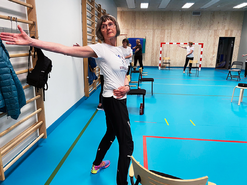Gruppetimen drives av kvalifiserte Sterk og Stødig-instruktører som får oppfølging av kommunale fysioterapeuter. Ann-Karin Tangen Erichsen er en av dem. I dag sto hun for oppvarmingen - der det gjelder å få opp pulsen. Dette gjør hun, og alle de andre, som frivillige. Et meningsfullt arbeid, synes Ann-Karin (Til høyre i bildet).