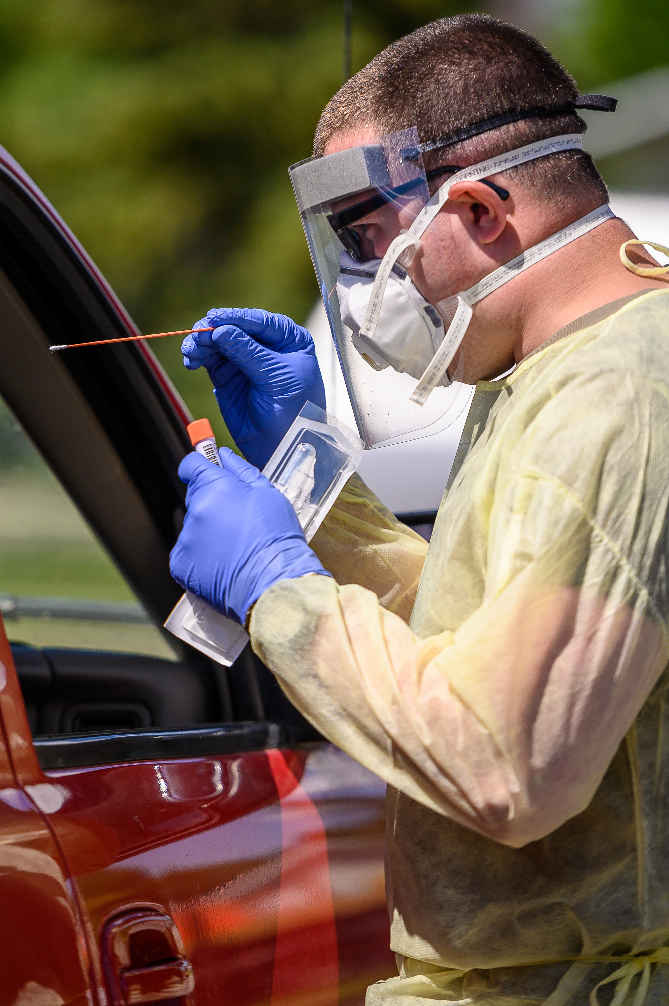 Col. Brian Keller, State Medical Detachment, administers a COVID-19 test at the mobile testing site at the N.D. State Capitol in Bismarck on June 17.