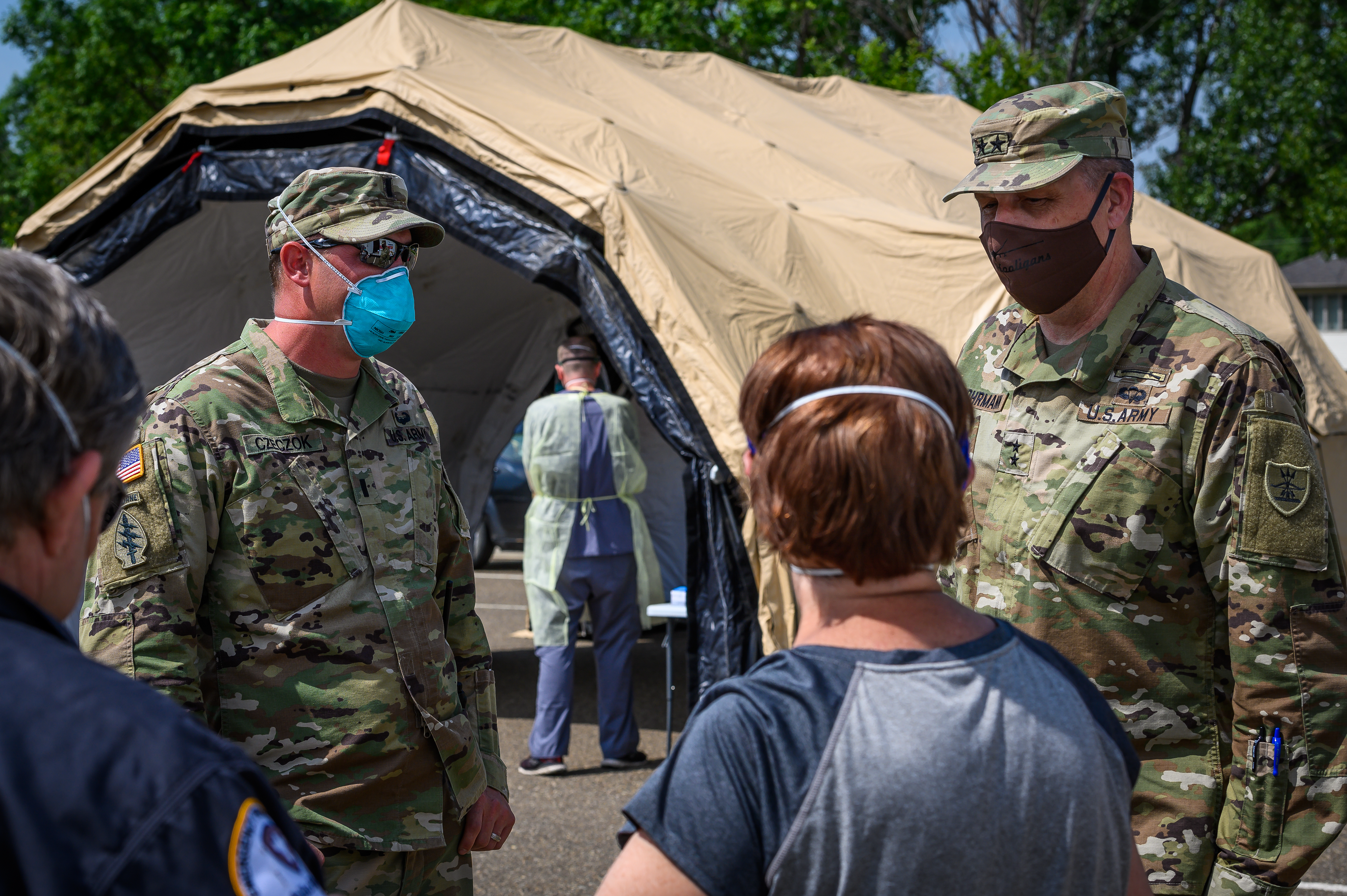 Maj. Gen. Al Dohrmann, right, N.D. National Guard adjutant general, visits the COVID-19 mobile testing site at the State Capitol in Bismarck on June 17.